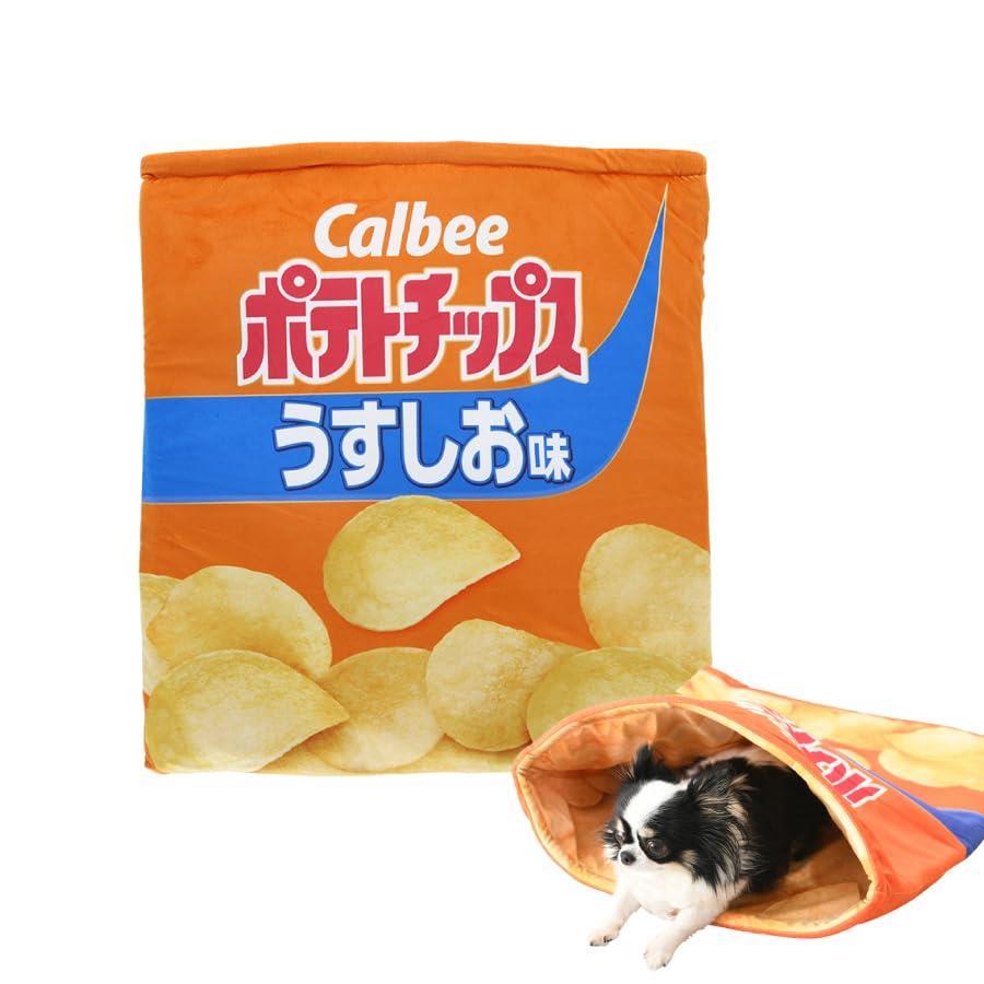 カルビーが販売する人気商品のパッケージがリアルにデザインされたペット用のベッドが新発売!『ポテトチップス うすしお味』入口部分にはワイヤーが入っており形状を固定できます。