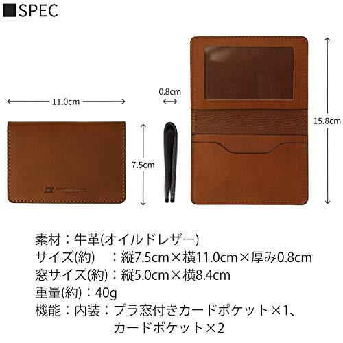 素材:牛革(オイルドレザー)、サイズ(約):縦7.5cm×横11.0cm×厚み0.8cm、窓サイズ(約):縦5.0cm×横8.4cm、重量(約):40g、機能:内装…プラ窓付きカードポケット×1、カードポケット×2