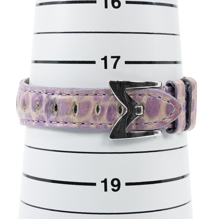 ベルトも薄紫色のものが合わせられており、全体として統一感のあるフェミニンな雰囲気に仕上がっております。