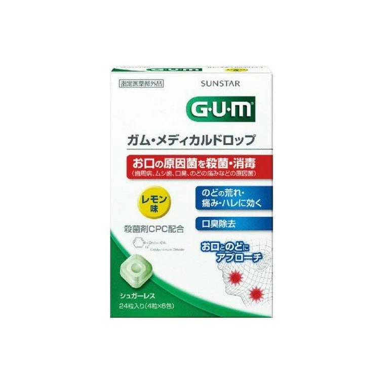 ※パッケージデザイン、内容量、原材料名等は予告なく変更する場合があります。パッケージデザイン、内容量、原材料名が異なる場合でも、返品、交換の対応は不可となりますので予めご了承下さい。メーカー品切れになっている場合は予定日より出荷が遅れることもございますので予めご了承ください発送までに7営業日以上かかる場合は別途ご連絡いたします。GUM(ガム) メディカルドロップ レモン味 24粒歯周病菌などに対し、殺菌作用のある成分CPC(塩化セチルピリジニウム)配合のドロップです。お口の原因菌を殺菌・消毒いたします。シュガーレス。医薬部外品。 使用上の注意相談すること1.次の人は使用前に医師、歯科医師又は薬剤師に相談してください。(1)医師又は歯科医師の治療を受けている人。(2)本人又は家族がアレルギー体質の人。(3)薬によりアレルギー症状を起こしたことがある人。2.次の場合は直ちに使用を中止し、この外箱を持って医師、歯科医師又は薬剤師に相談してください。(1)使用後、皮ふに発疹・発赤、かゆみがあらわれた場合。(2)5-6日間使用しても症状がよくならない場合。 成分・分量(12粒中)塩化セチルピリジニウム6mg添加物:還元パラチノース、銅クロロフィリンNa、クエン酸Na、アスパルテーム(L-フェニルアラニン化合物)、l-メントール、香料 効能・効果口腔内の殺菌・消毒、口臭の除去、のどの炎症による声がれ・のどのあれ・のどの不快感・のどの痛み・のどのはれ 用法・用量大人(15歳以上)及び5歳以上の小児/1回2粒、1日3-6回1粒ずつ2粒までを口中に含み、かまずにゆっくり溶かして使用してください。2時間以上の間隔をおいて使用してください。(用法・用量に関連する注意)(1)定められた用法・用量を厳守してください。(2)小児に使用させる場合には、保護者の指導監督のもとに使用させてください。(3)かみくだいたり、のみこんだりしないでください。 保管および取扱い上の注意(1)直射日光の当たらない涼しい所に保管してください。(2)スティックパック開封後は、袋の口を折り返して保管してください。(3)小児の手の届かない所に保管してください。(4)他の容器に入れ替えないでください。(誤用の原因になったり品質が変わることがあります)(5)使用期限(側面に記載)を過ぎた製品は使用しないでください。 口臭清涼剤とは口臭清涼剤は、エチケットとして口臭ケアに用いるだけでなく、リフレッシュ目的で使用されています。そのため、カプセルや粒、液体の形状で飲み込むタイプのほかに、さわやかなフレーバーを楽しめる飴やガム、ラムネのような菓子タイプもあります。口臭ケアを主眼とした商品には、葉緑素(クロロフィル)やお茶のフラボノイド、パセリ油が消臭成分として配合されているものが多いようですが、中には口臭の原因となる菌を殺菌するCPC(塩化セチルピリジニウム)を配合した医薬部外品もあります。口臭、気分爽快にとは(口臭、気分爽快に)とは、エチケットとして口臭ケアに用いたり、リフレッシュ目的の医薬部外品です。口臭の原因となる菌を殺菌するCPC(塩化セチルピリジニウム)を配合したものや、桂皮(シナモン)や薄荷(ミント)など香りの良い生薬を配合したものがあります。医薬部外品全部とは(医薬部外品全部)とは、薬事法に定められた医薬部外品の商品群です。通常、医薬部外品には一般の医薬部外品のほかにも医薬部外品、防除用医薬部外品が含まれますが、(医薬部外品全部)では主に指定医薬部外品を指しています。賞味期限等の表記について パッケージに記載。