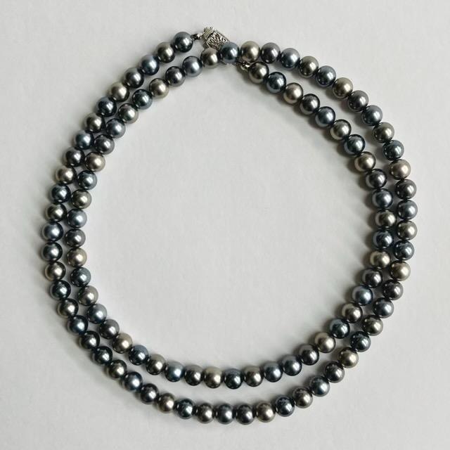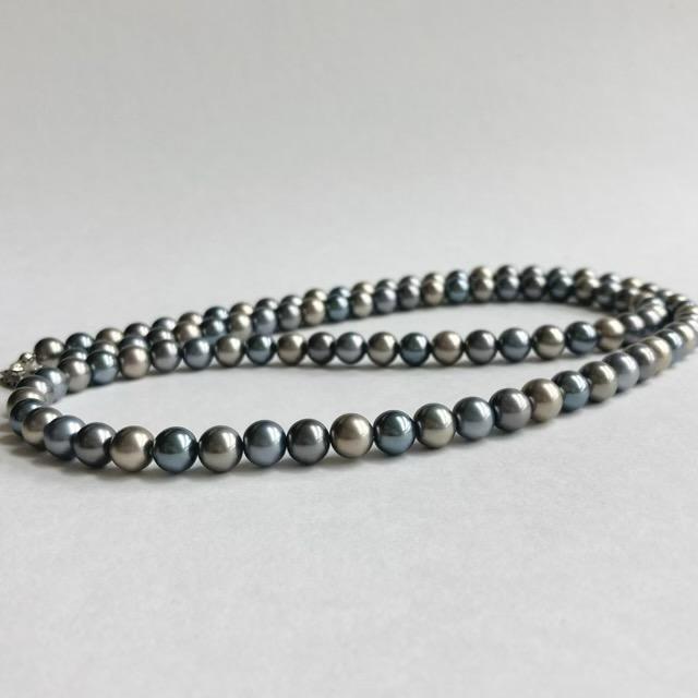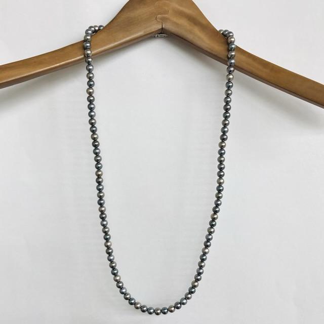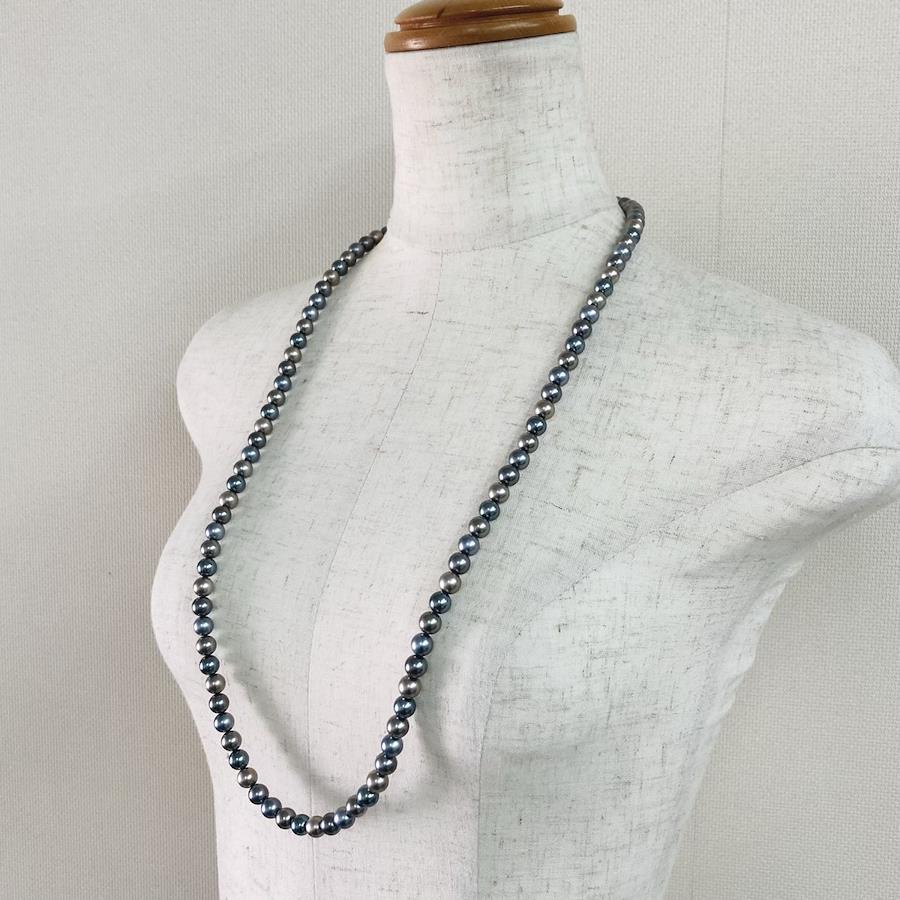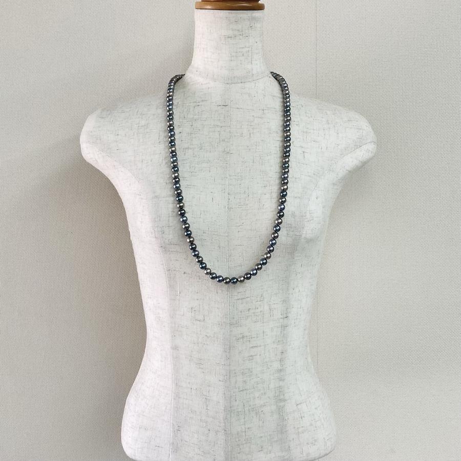 こちらはガラス素材の原玉を使用した日本製ガラスパールネックレスになります。パールサイズはスタンダードな直径約8mm玉で、長さは服の上からでもゆったり着けられる全長約82cm。パールカラーは異なる複数のグレー系統のパールを使用。