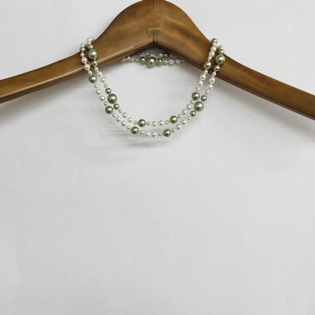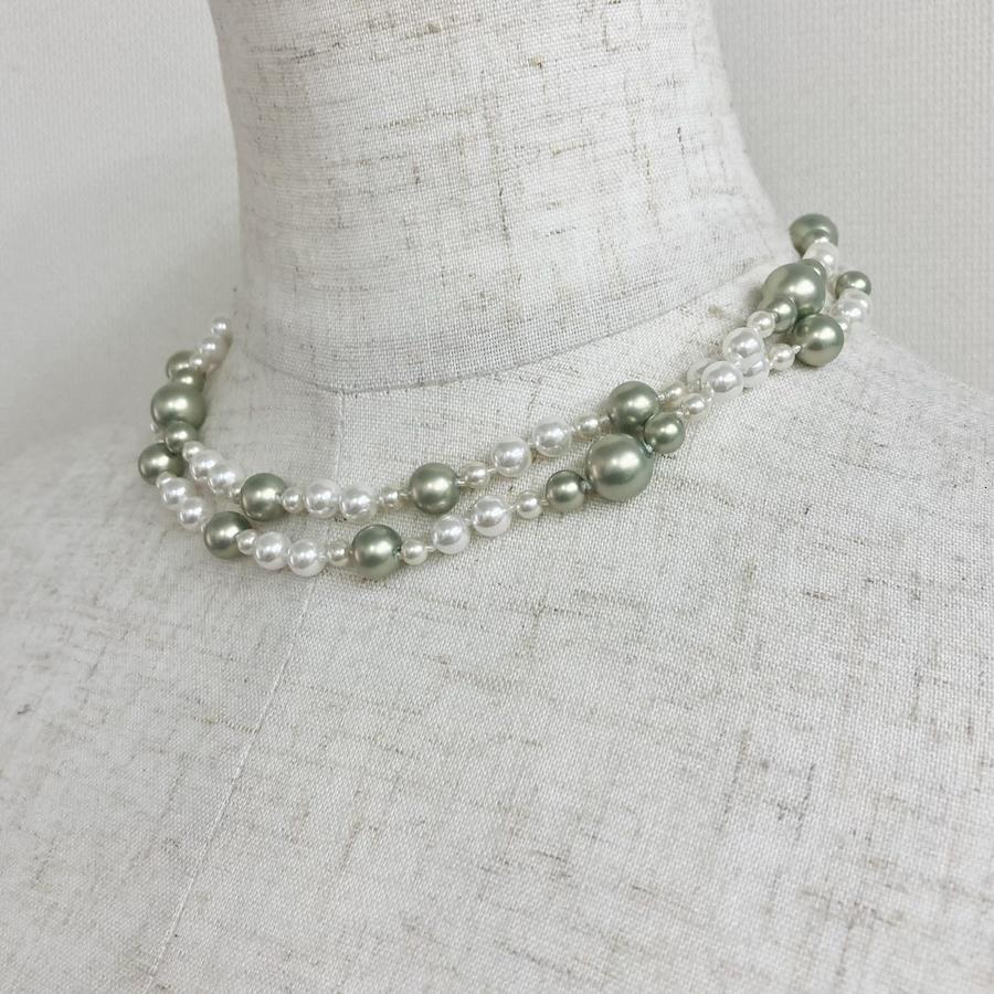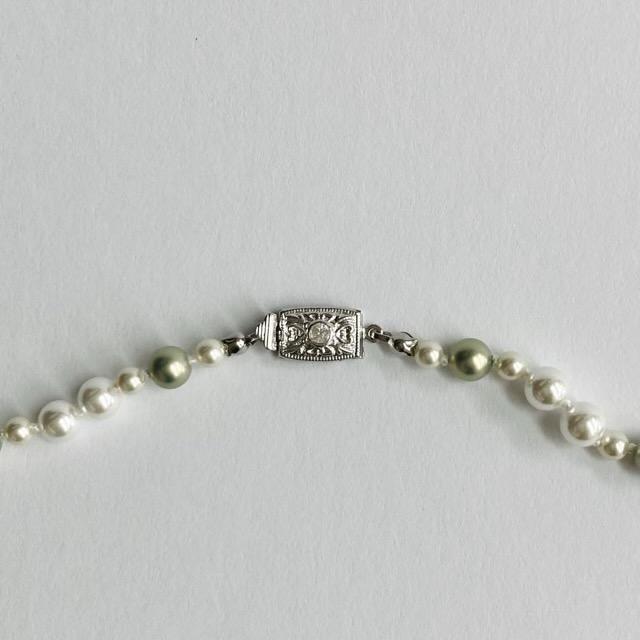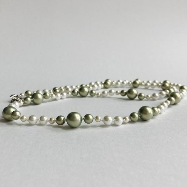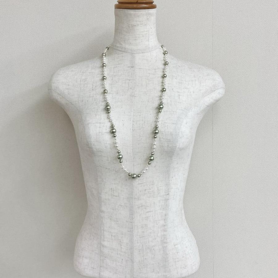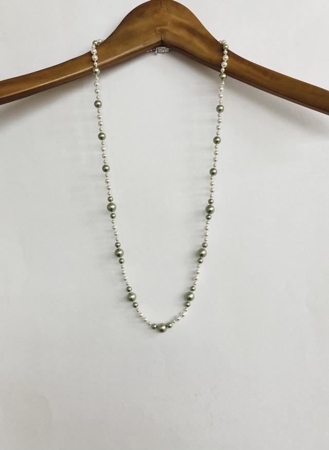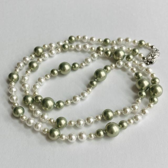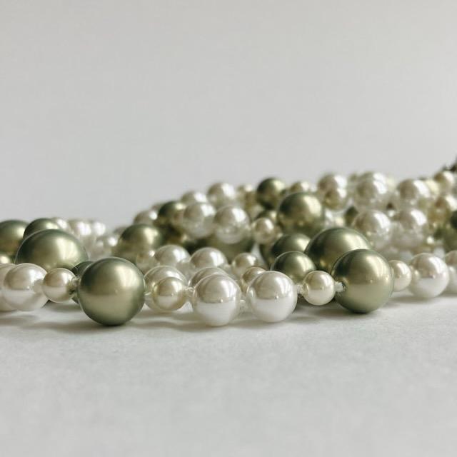 パールは当店のオリジナルカラーパールで、きめ細かい質感と程良い艶感が個性的なグリーンパールとスタンダードなホワイト・クリームパールをランダムに使用しております。※原玉にはピンホールや小さい凹み等が見られる場合がございますが、自社にて検品の上許容範囲とさせて頂いております。