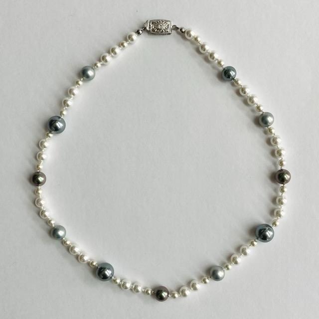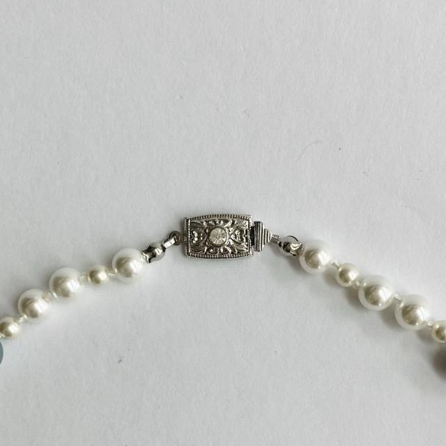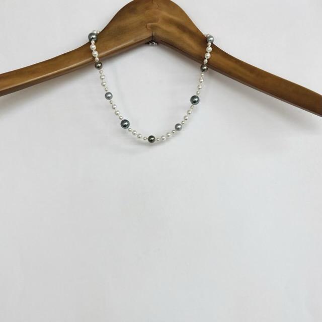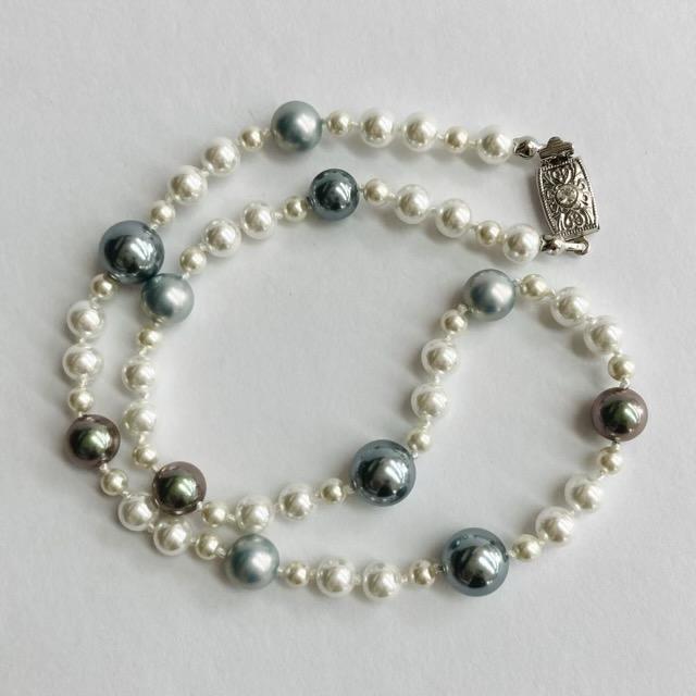 こちらはガラス素材の原玉を使用したオリジナル日本製ガラスパールネックレスです。パールとパールの間に1つづつ結び目を入れたオールノット仕様で、ワンランク上のコスチュームジュエリーとなっております。パールサイズは直径約6mm~10mmサイズをランダムに通し、長さは全長約43cmと標準的なプリンセスサイズになっております。ガラスパール特有の高級感漂う重みとオールノット仕様で存在感のあるネックレスになっております。※オールノット加工は、玉同士に隙間があるため擦れ合いにくく・キズなどが付きにくい、又、結び目があることで動きがありしなやかさもある、更に、万が一糸が切れてしまった時でも最小限で抑えられる等が特徴です。