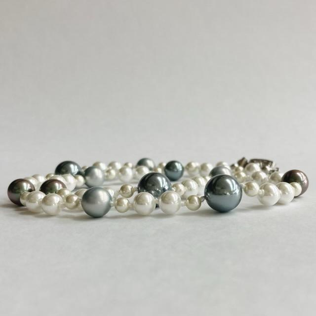 パールは当店のオリジナルカラーで、きめ細かい質感と程良い艶感のブルー系カラーとホワイトカラーのmixとなっております。※原玉にはピンホールや小さい凹み等が見られる場合がございますが、自社にて検品の上許容範囲とさせて頂いております。