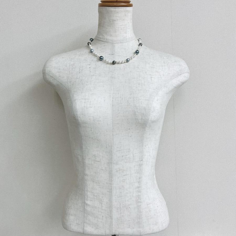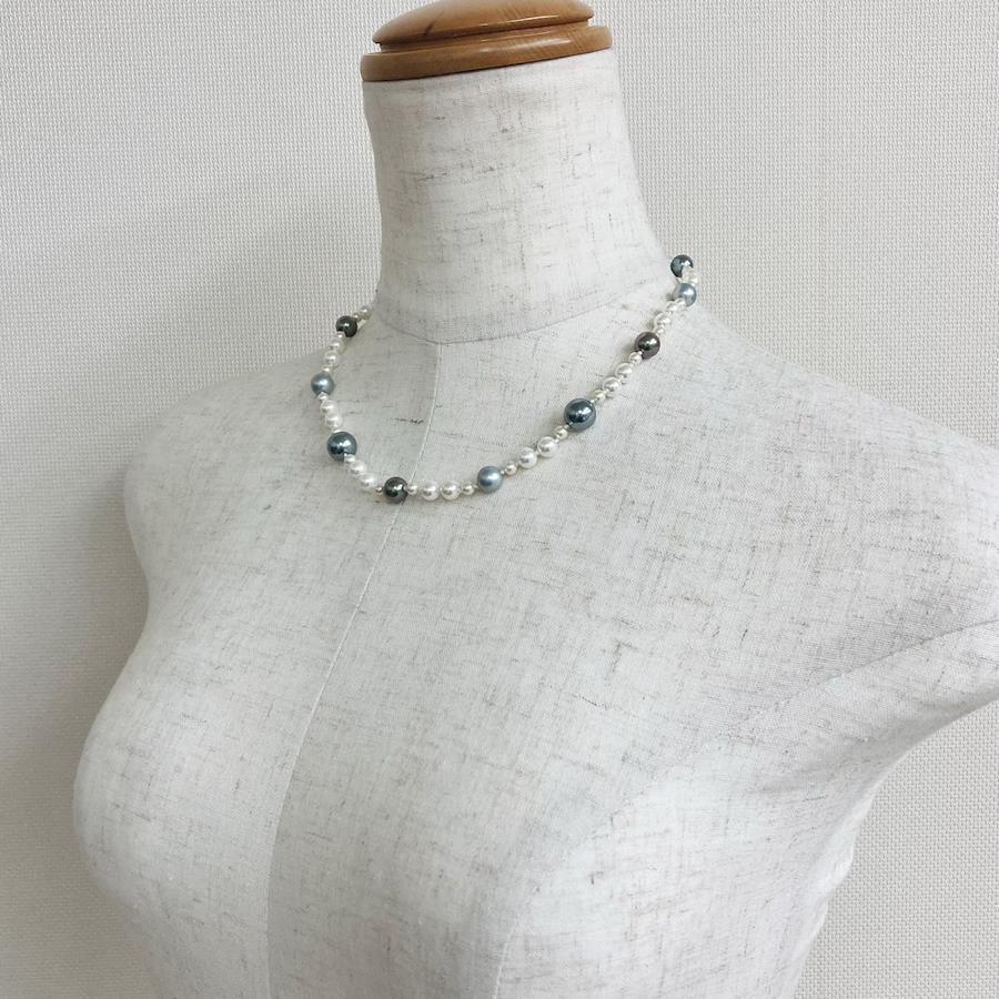 ガラスパールランダムmix all knotネックレス/6x10mm約43cm/ブルーxホワイト/made in japan