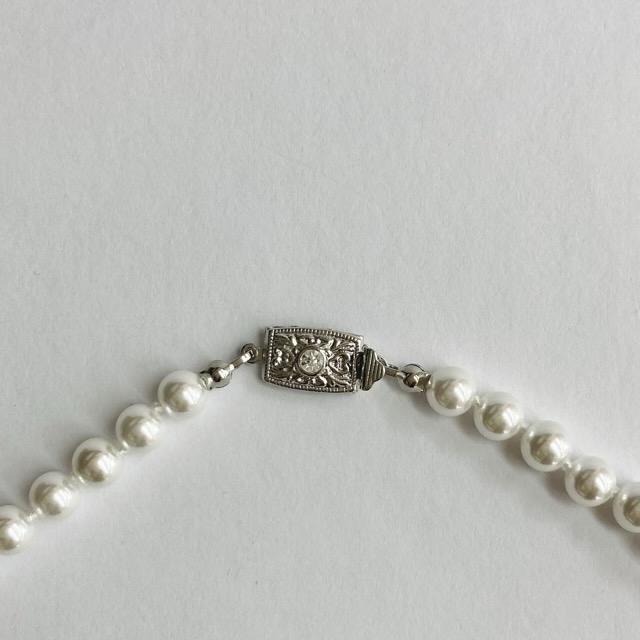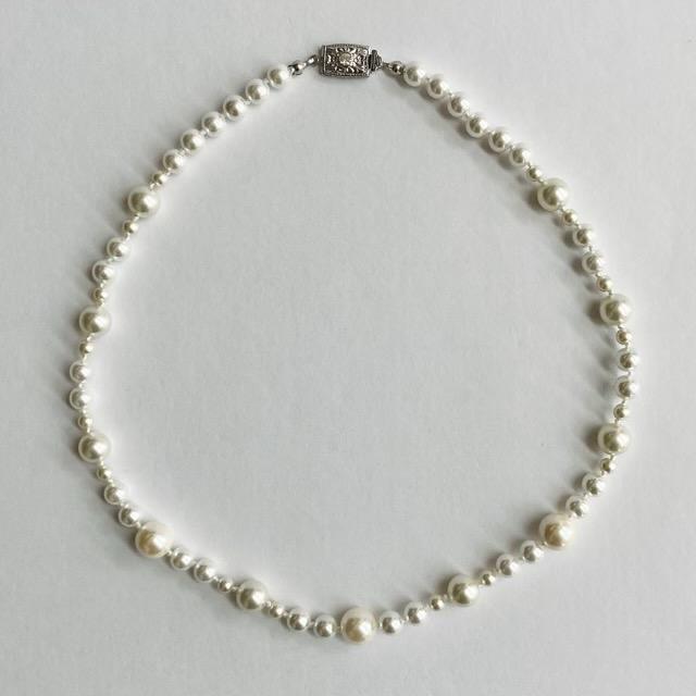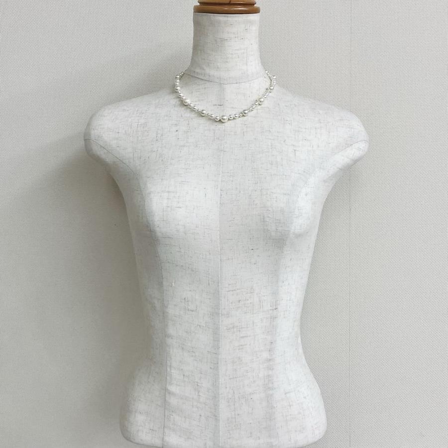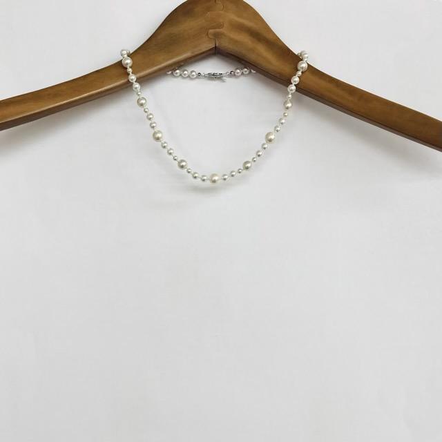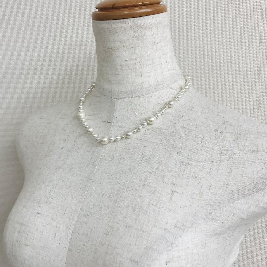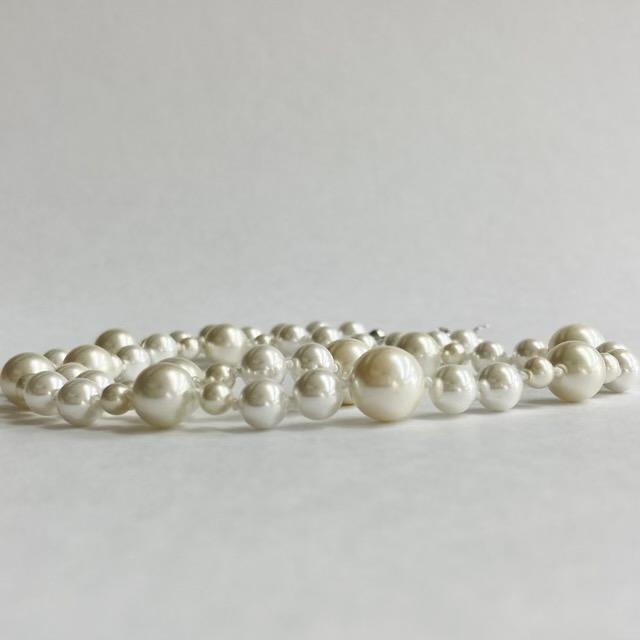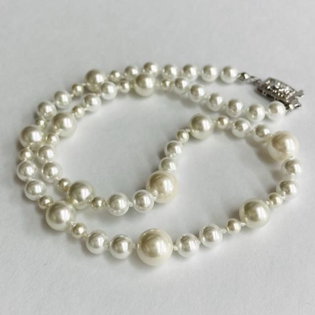 こちらはガラス素材の原玉を使用したオリジナル日本製ガラスパールネックレスです。パールとパールの間に1つづつ結び目を入れたオールノット仕様で、ワンランク上のコスチュームジュエリーとなっております。パールサイズは直径約6mm~10mmサイズをランダムに通し、長さは全長約43cmと標準的なプリンセスサイズになっております。ガラスパール特有の高級感漂う重みとオールノット仕様で存在感のあるネックレスになっております。※オールノット加工は、玉同士に隙間があるため擦れ合いにくく・キズなどが付きにくい、又、結び目があることで動きがありしなやかさもある、更に、万が一糸が切れてしまった時でも最小限で抑えられる等が特徴です。