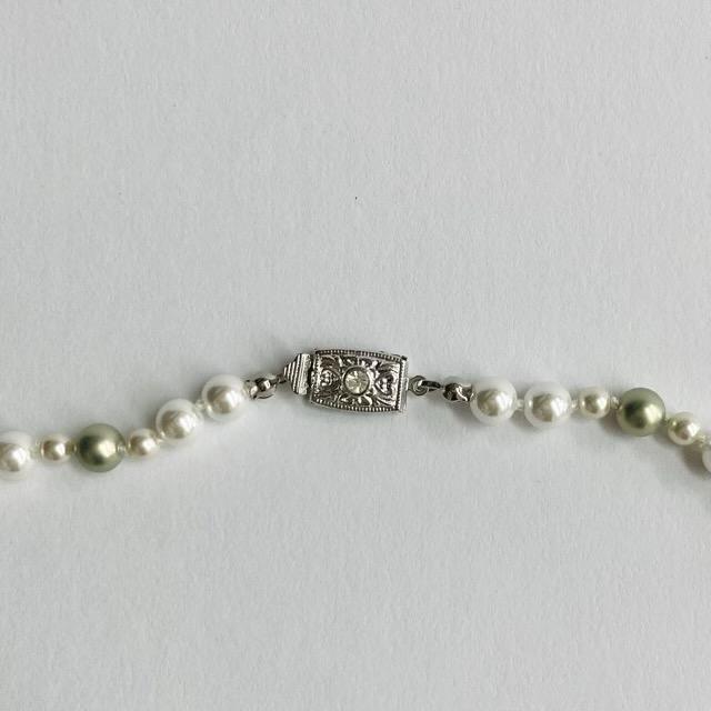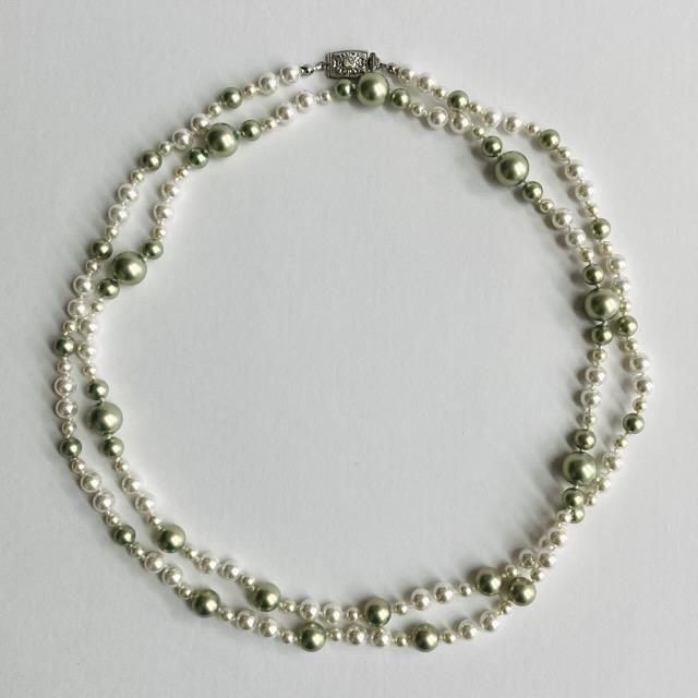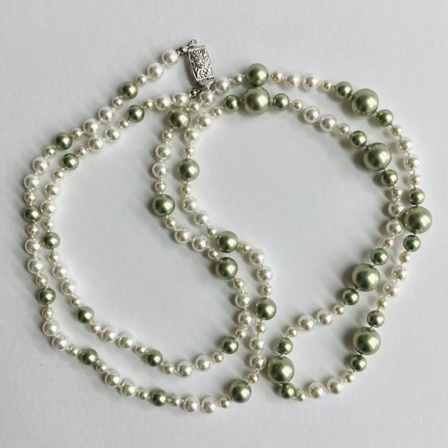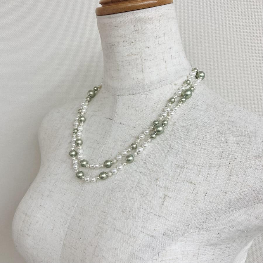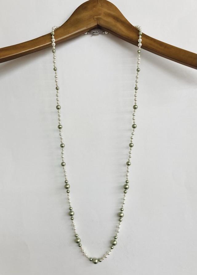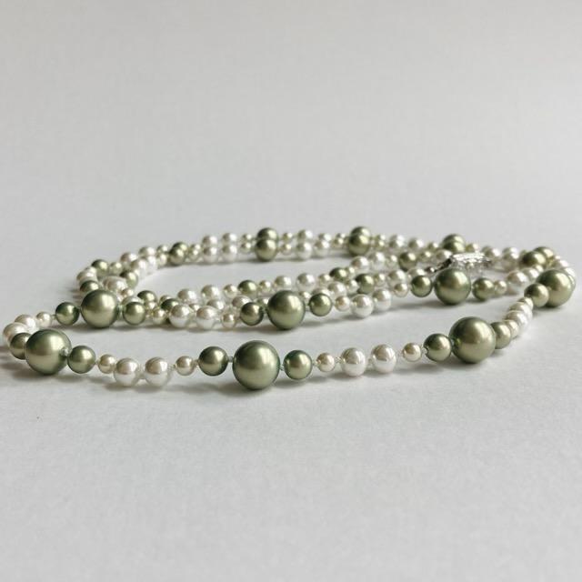 パールは当店のオリジナルカラーパールで、きめ細かい質感と程良い艶感が特徴のグリーンパールとスタンダードなホワイトパールを使用しております。※原玉にはピンホールや小さい凹み等が見られる場合がございますが、自社にて検品の上許容範囲とさせて頂いております。