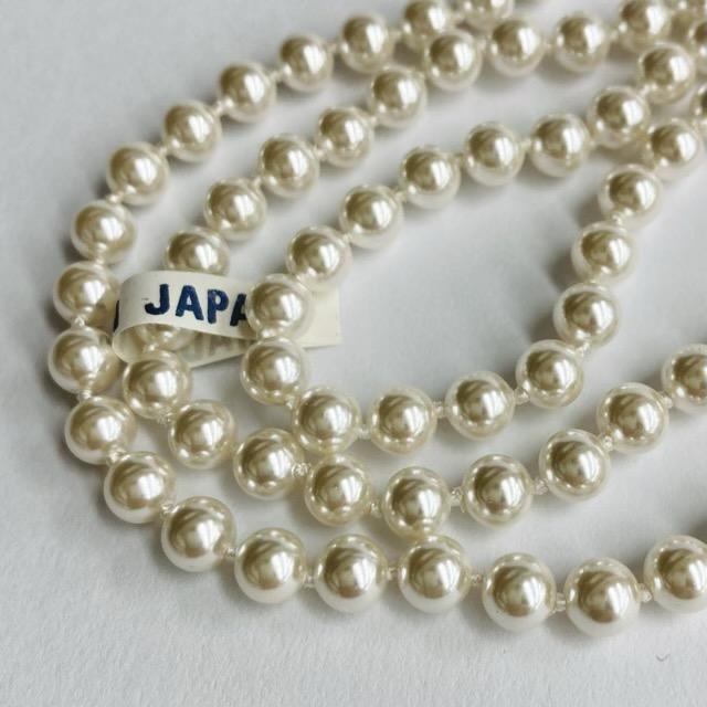 こちらはガラス素材の原玉を使用して生産した日本製ガラスパールネックレスになります。パールの間1つづつ丁寧に結び目を入れたオールノットタイプのネックレスになります。パールカラーは少し生成りがかったホワイトクリームパール。パールサイズは約6mm玉とやや小粒で、長さは全長約90cmございますので、ゆったりと1連ロングネックレスに、また巻き付けて2連ネックレスにとアレンジも可能です。※こちらは1980年代から1990年に、アメリカのコスチュームジュエリー向け日本製ガラスパールとして、当工場にて生産・輸出していた未使用のストックパールをして使用しております。色・艶・品質共に当時からの状態を保っておりきれいです。