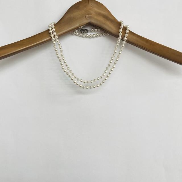 オールノットネックレスの特徴として、万が一糸が切れた場合にバラバラにならない点や、玉同士が密着していないので擦れあいにくく傷も付きにくい点・首回りにフィットしやすくなっている点等がございます。この仕様は特に海外で人気があり、比較的高品質アクセサリー類によくみられる仕様です。※当店の自社工場にて塗装されたパールになります。品質の状態も維持されており、剥がれや大きな目立った傷などもございません。※ピンホールや小さい凹み等が見られる場合がございますが、自社にて検品の上、品質に問題は無く許容範囲とさせて頂いております。