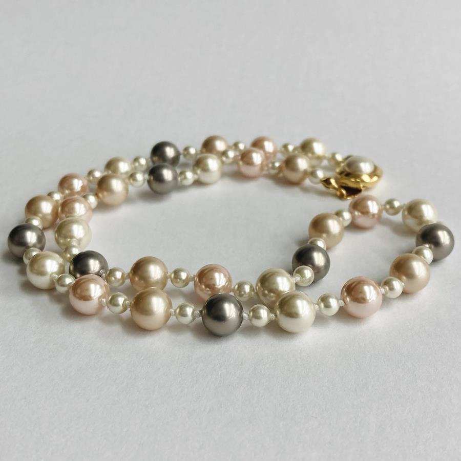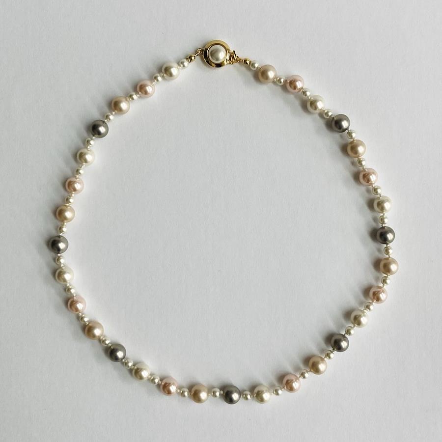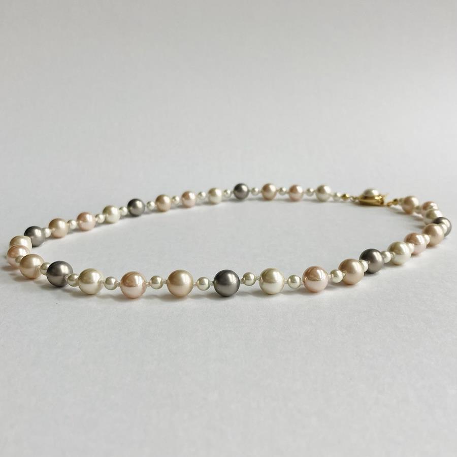 こちらはガラス素材の原玉に、オリジナルパール塗装を何層にも渡り重ね塗りを施した日本製ガラスパールネックレスになります。パールの間1つ1つに結び目を入れたオールノット仕様になります。直径約8mm玉で、長さは標準的なプリンセスサイズのやや長めになる全長約45cmになっております。パールカラーは、きめ細かい質感と優しい艶感が特徴のナチュラルカラー各種をミックスして通しました。