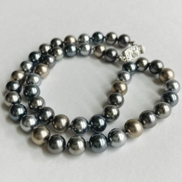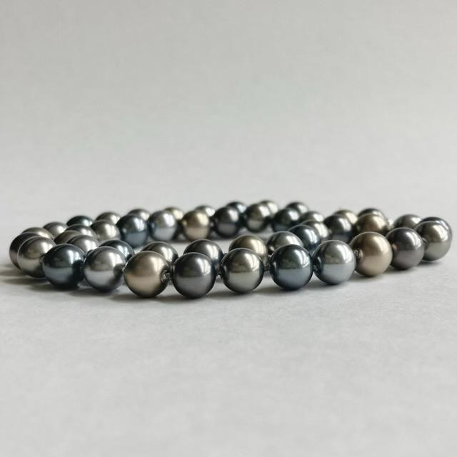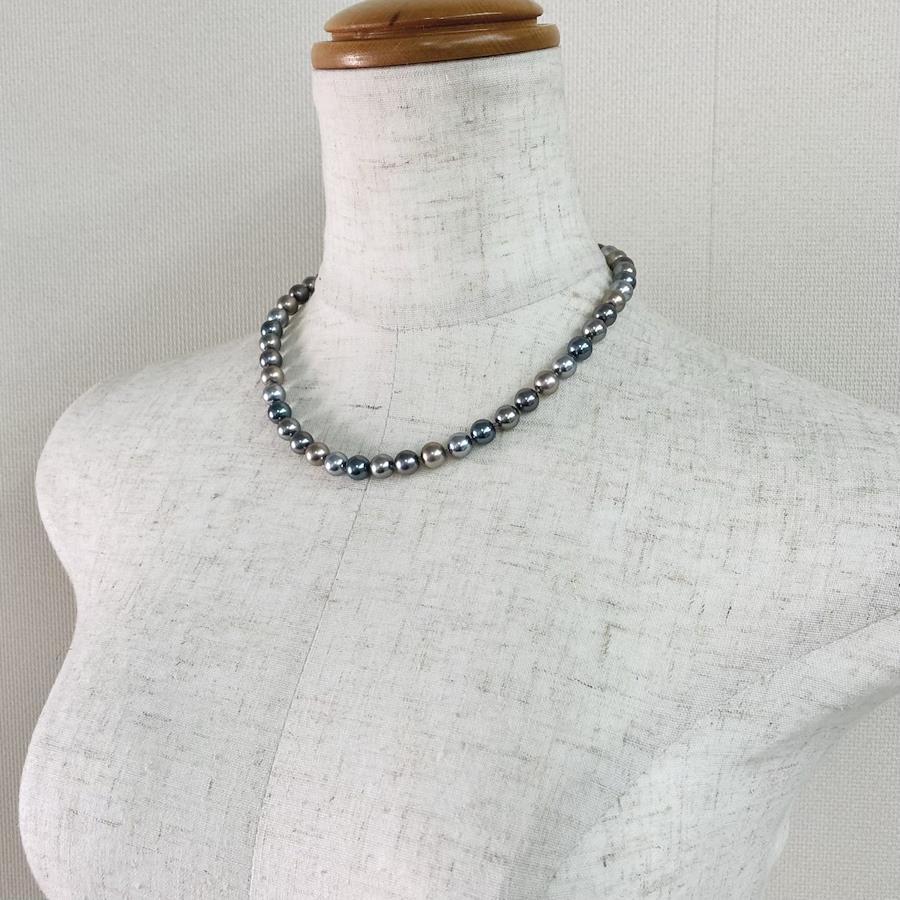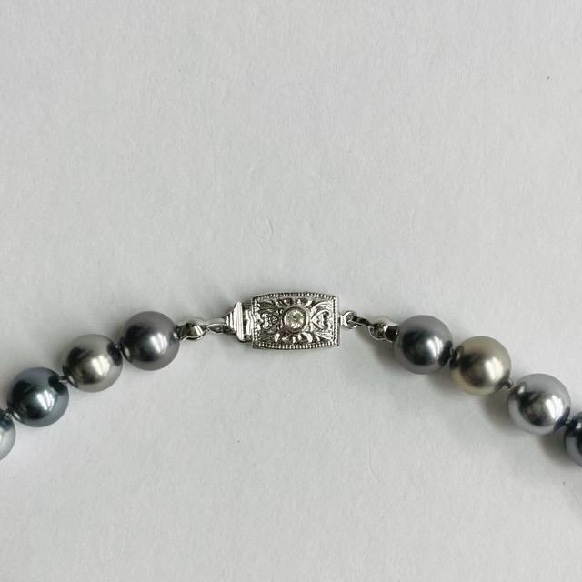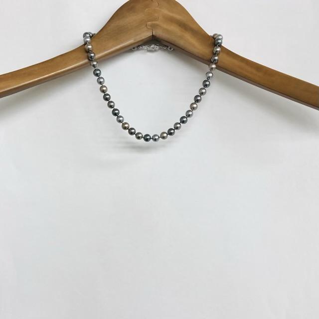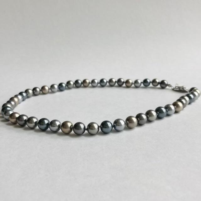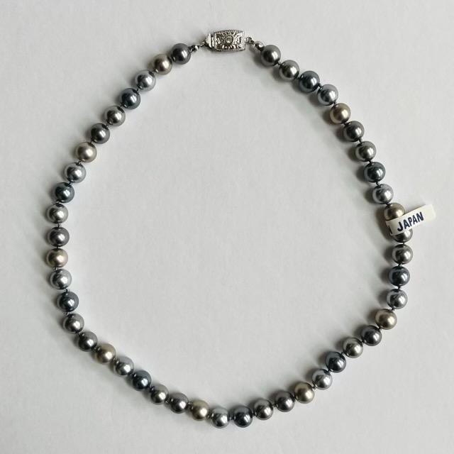こちらはガラス素材の原玉を使用した日本製ガラスパールネックレスになります。パールの間1つ1つに結び目を入れたオールノット加工を施しております。パールサイズはスタンダードな直径約8mm玉で、長さは標準的なプリンセスサイズの全長約43cm。パールカラーは異なる複数のグレー系統のパールを使用。