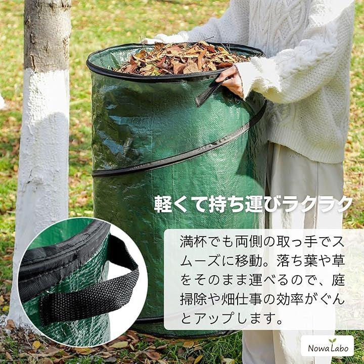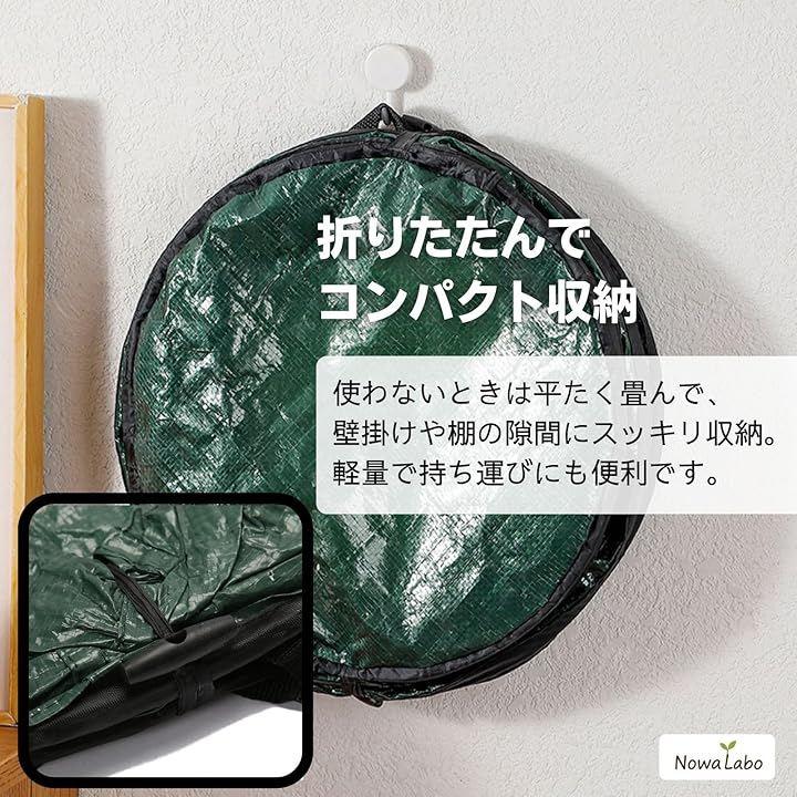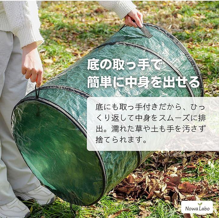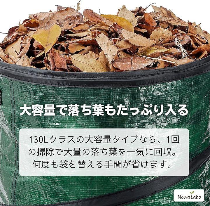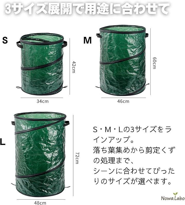 「サイズ別で使い分けが便利」 S:約直径34x高さ42cm(38L落ち葉や小枝など少量の掃除に) M:約直径46x高さ60cm(100L)家庭菜園やベランダ清掃などに L:約直径48x高さ72cm(130L)剪定くずや大量の草集めに最適