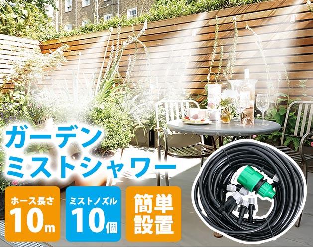 ★暑い夏のガーデニングもミストシャワーで涼しさ演出!*電源・工具不要!蛇口に繋いで設置するだけの簡単仕様で届いたその日からお使い頂けます。*82cm間隔にミストノズルが10個ついており、ミストシャワーで屋外の暑さ軽減!花壇への水やりが面倒な方でも設置さえすれば蛇口をひねるだけで一気に水やりができます。*お子さん水遊びに喜ばれること間違いなし!熱中症対策にもなります。*屋外で飼育されているペットの夏バテ防止にもなります。*結束バンド付きでどこでも設置可能!接着剤や粘着テープ不要なので何度でも場所を変えることができます。追加の結束バンドは100均等でお買い求めください。*室外機周りに設置すれば節電効果も期待できます。