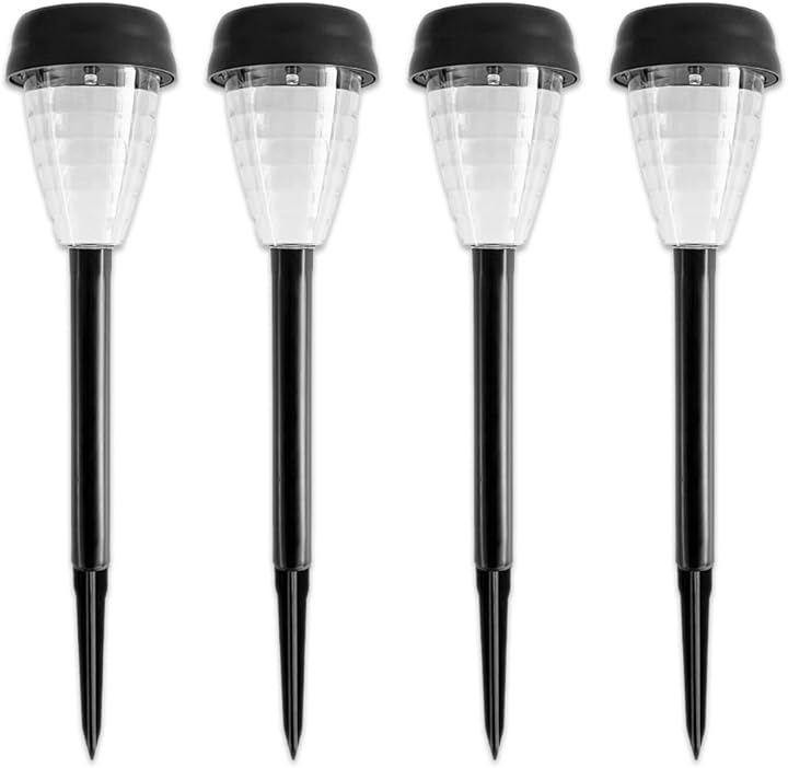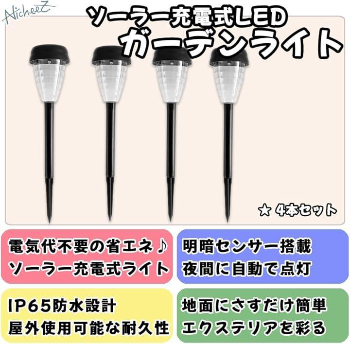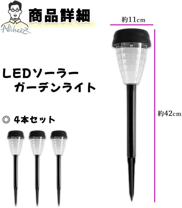 「商品内容」 LEDソーラーガーデンライト4個セット 材質:ABSプラスチック サイズ:幅/約11cm 高さ/約42cm