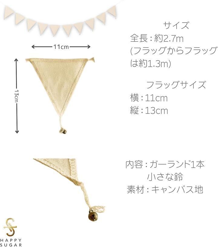 「商品詳細」全長 約2.7m(フラッグからフラッグは約1.3m)、フラッグサイズ 11x13cm、内容:ガーランド1本、素材:薄いキャンバス地s