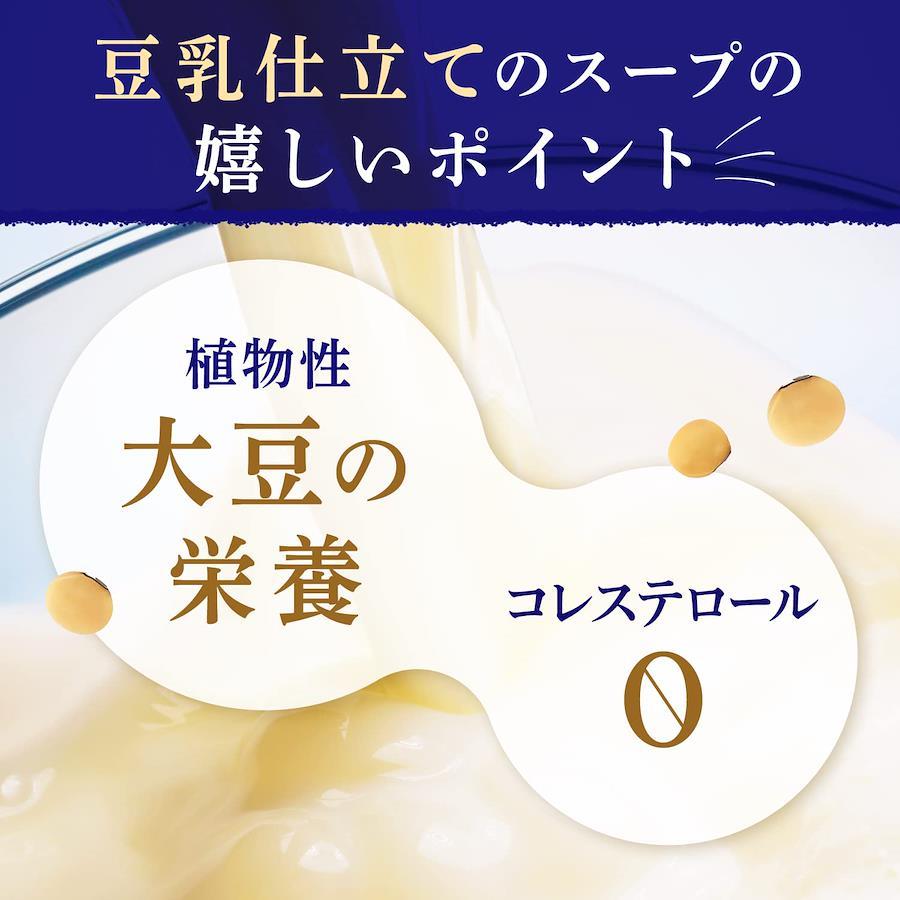 豆乳(大豆(カナダ又はアメリカ)(分別生産流通管理済み))、コーンピューレ、砂糖、粉末おから、植物油脂、食塩、炒めたまねぎ、酵母エキス、香辛料/増粘剤(加工でん粉)、pH調整剤、香料、乳化剤