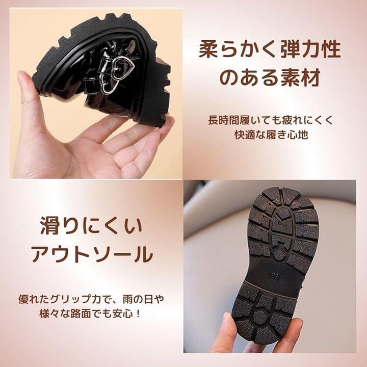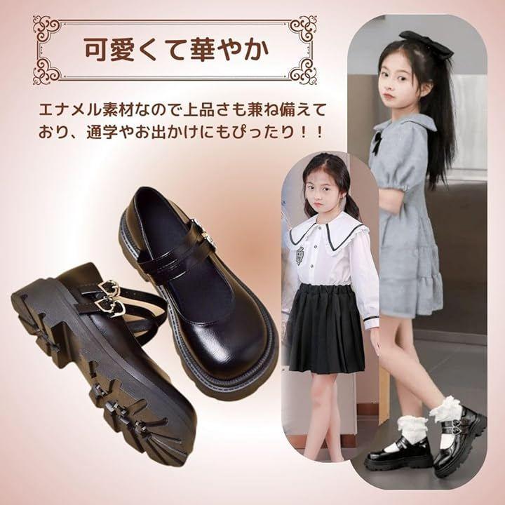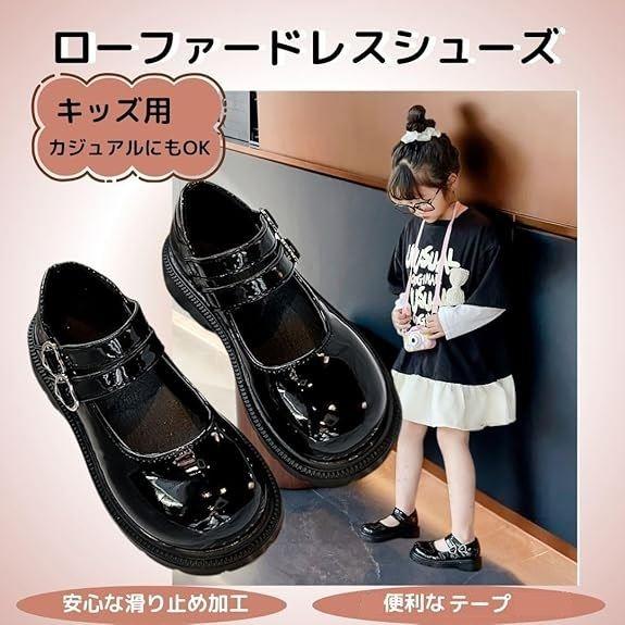 上品なエナメルブラックの光沢が足元を華やかに彩る、女の子用フォーマルシューズです。