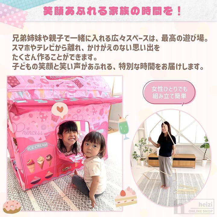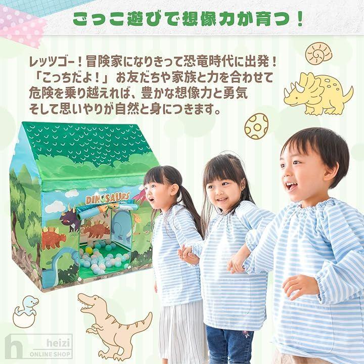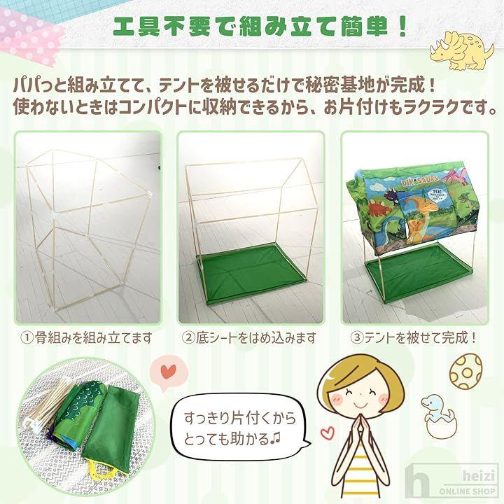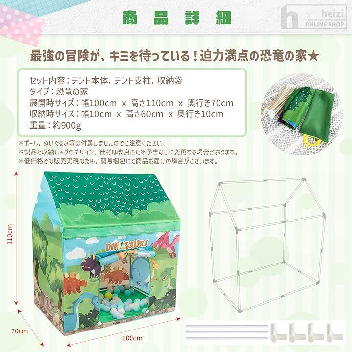 「商品内容」テント本体、支柱、収納袋・2デザイン(お菓子屋さん/恐竜の家)サイズ展開時100x110x70cm 重量約900g