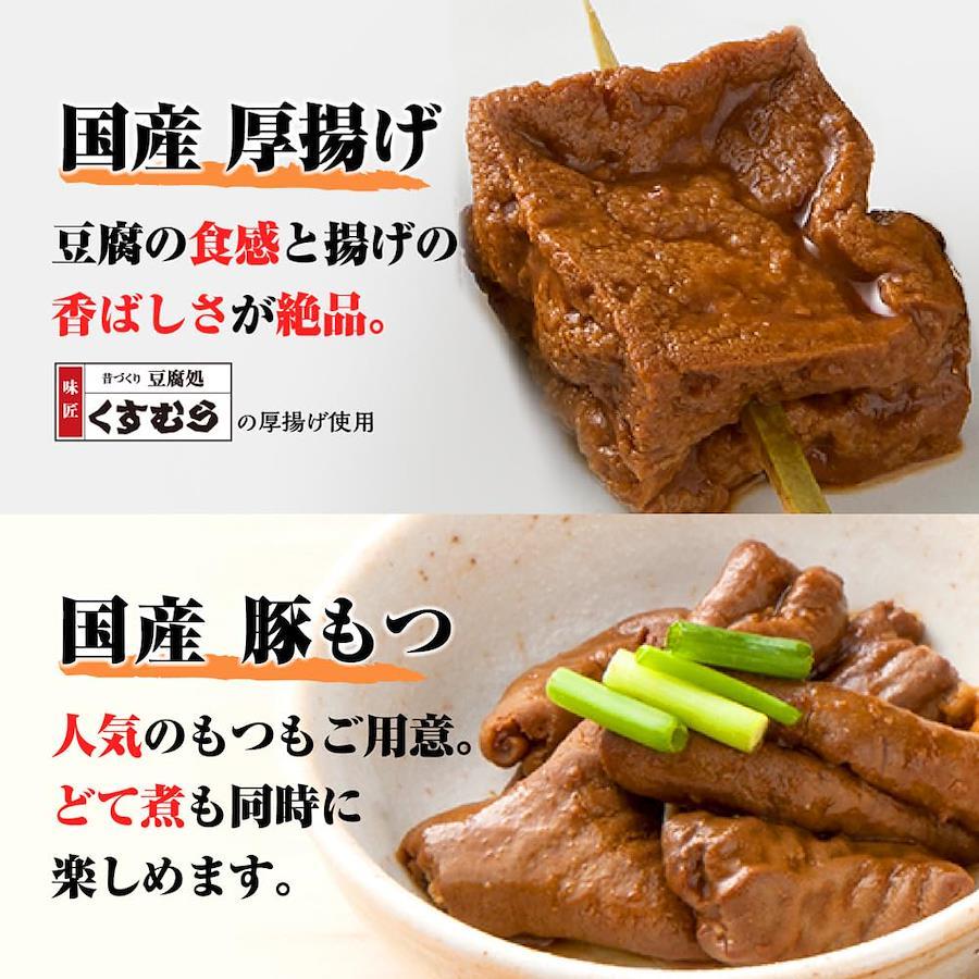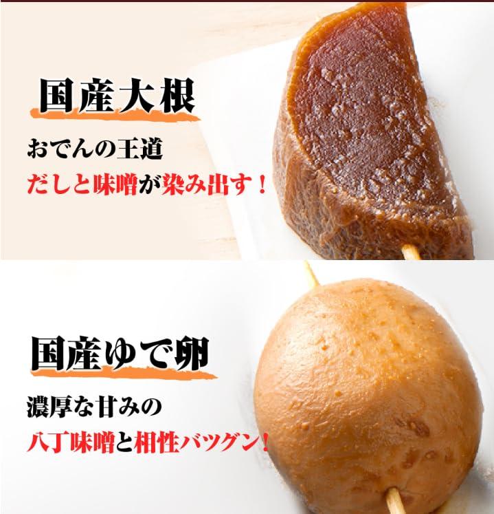 野菜(大根、里芋)(国産)、ゆで卵(鶏卵(国産))、豚小腸、こんにゃく、豆みそ、 砂糖 、厚揚げ、本みりん、還元水あめ、清酒、かつおぶし、おろししょうが /増粘剤(加工でんぷん)、水酸化Ca、豆腐用凝固剤、(一部に卵・大豆・豚肉を含む)