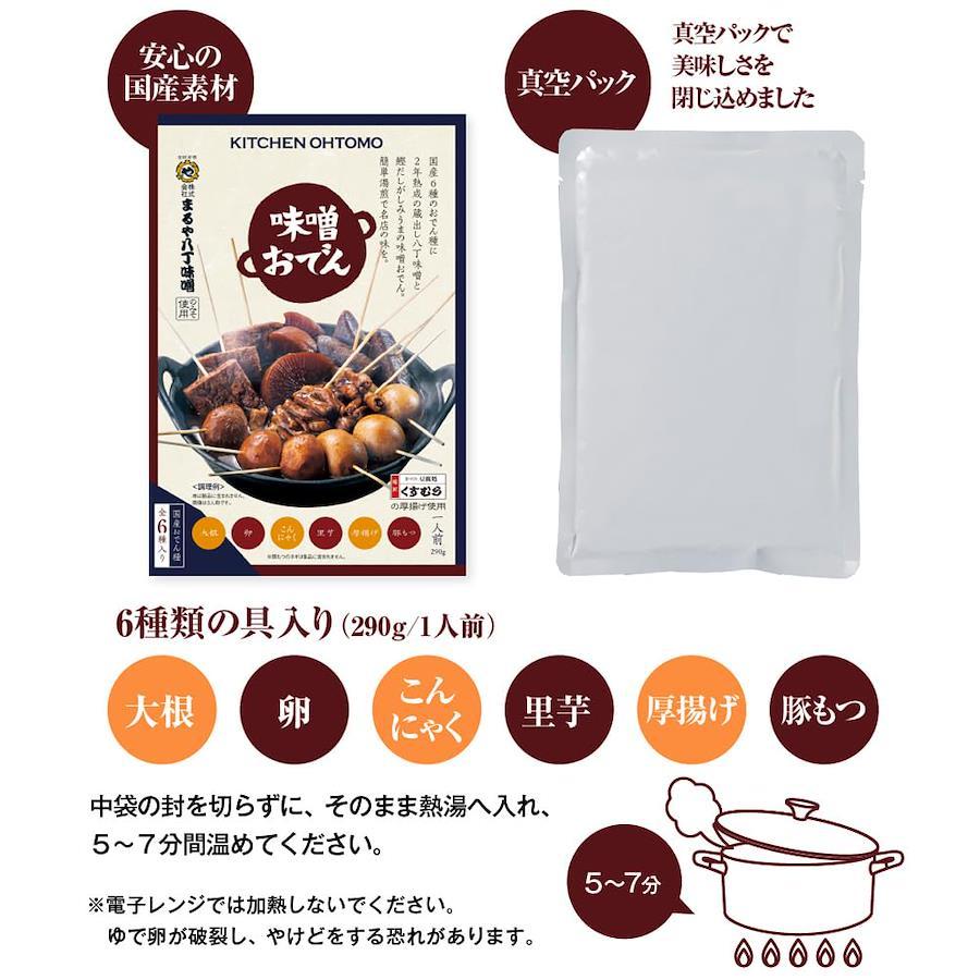 まるや八丁味噌100%使用国産おでん種使用(大根、ゆで卵、こんにゃく、厚揚げ、里芋,豚モツ)化学調味料無添加湯煎で5~7分温めでお召し上がり頂けます残った味噌だれでチーズリゾットも賞味期限は製造日より常温で1年化粧箱入りで手土産やギフトにも内容量:1人前(290g)レトルトおでん名古屋名物どて煮も楽しめます【重要】メーカーによる商品リニューアルに伴いパッケージ(内容量も含む)変更が行われた場合、新パッケージでお届け致します事ご了承願います。