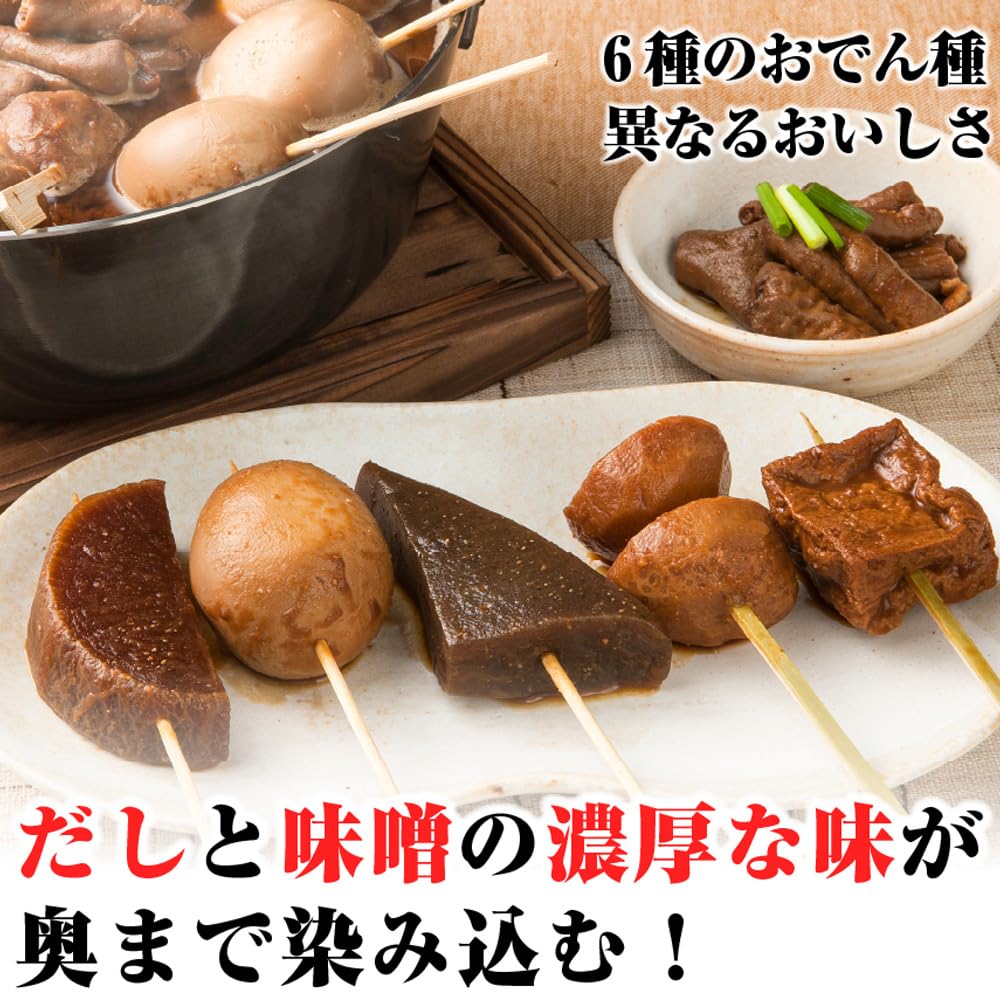 国産計6種のおでん種(卵、大根、こんにゃく、里芋、厚揚げ、豚モツ)に2年熟成の甘めの蔵出し八丁味噌と極上だしがしみうまの味噌おでん。ご自宅では味付けが難しい名店の味が湯煎してお楽しみいただけます。お酒の肴に、丼の具材にも絶品です。また揚げたての串カツを八丁味噌に潜らせれば名物味噌串カツに早変わり。おでんを平らげた後は白飯とチーズでリゾットも楽しめます。