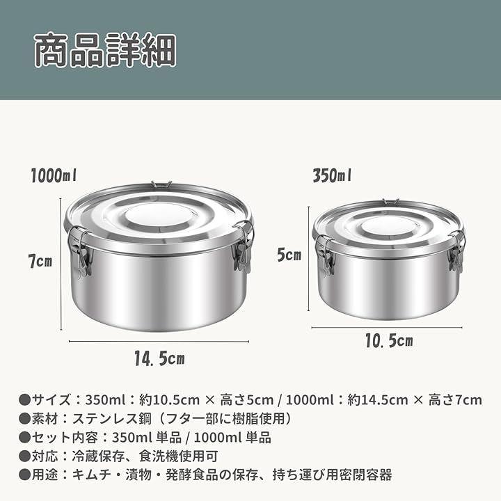 「商品詳細」 *サイズ:350ml:約10.5cm x 高さ5cm / 1000ml:約14.5cm x 高さ7cm *素材:ステンレス鋼(フタ一部に樹脂使用) *セット内容:350ml 単品 / 1000ml 単品 *対応:冷蔵保存、食洗機使用可 *用途:キムチ・漬物・発酵食品の保存、持ち運び用密閉容器
