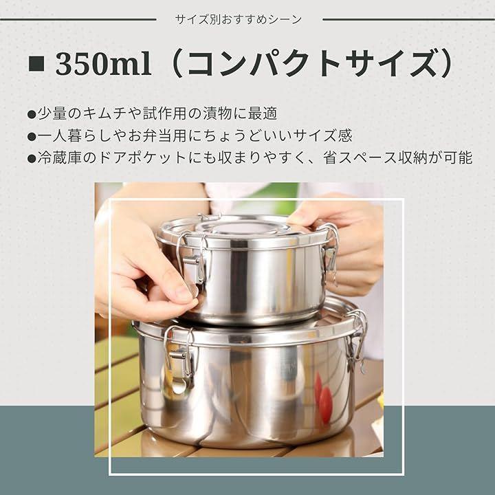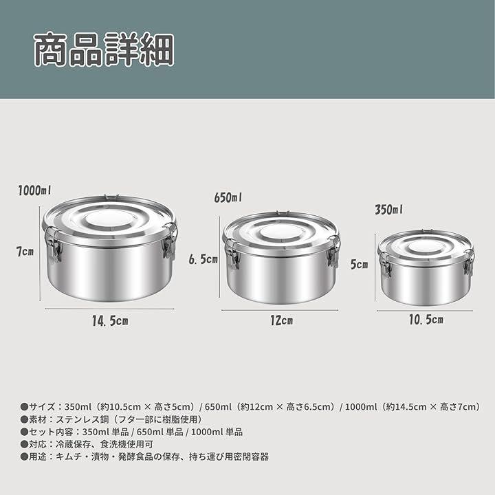 「商品詳細」 *サイズ:350ml:約10.5cm x 高さ5cm / 650ml:約12cm x 6.5cm / 1000ml:約14.5cm x 高さ7cm *素材:ステンレス鋼(フタ一部に樹脂使用) *セット内容:350ml 単品 / 650ml 単品 / 1000ml 単品 *対応:冷蔵保存、食洗機使用可 *用途:キムチ・漬物・発酵食品の保存、持ち運び用密閉容器