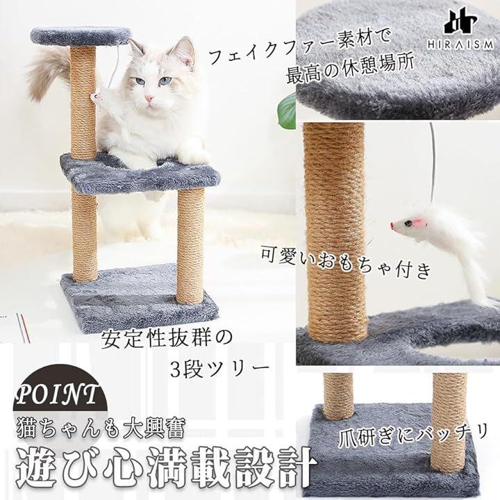「遊び心満載の多機能タワー」安定性の高い3段のツリーは愛猫が登り降りしたり、ジャンプしたりすることで、筋肉や敏捷性を鍛えることができ、表面のフェイクファーは柔らかく、猫の休憩場所としてもばっちり。