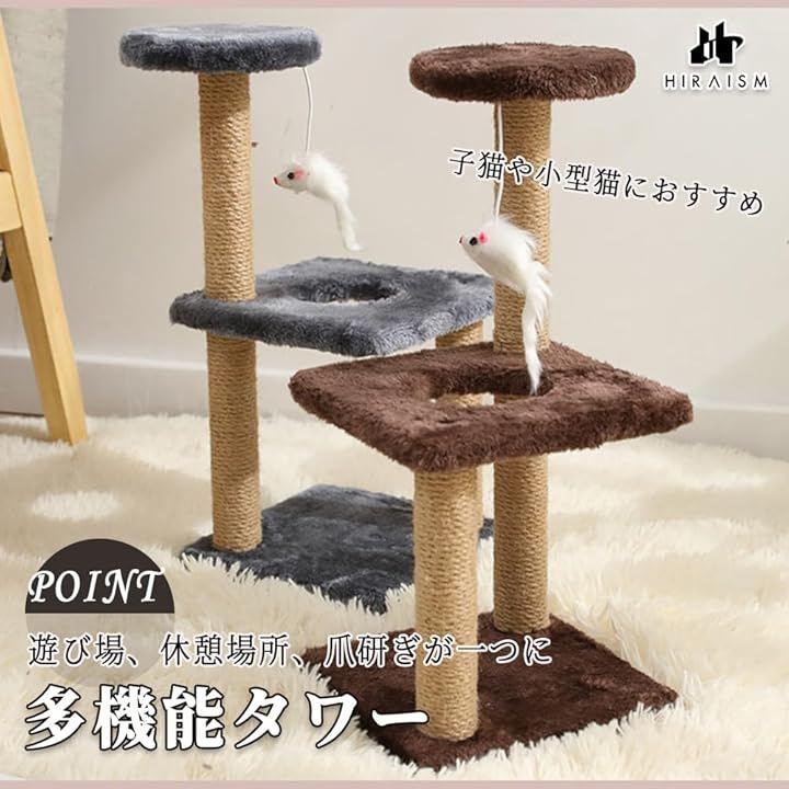 遊び場、休憩場所、爪とぎが一つにまとまった多機能タワーです。