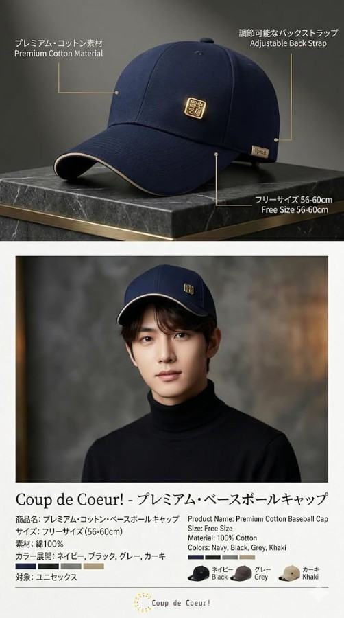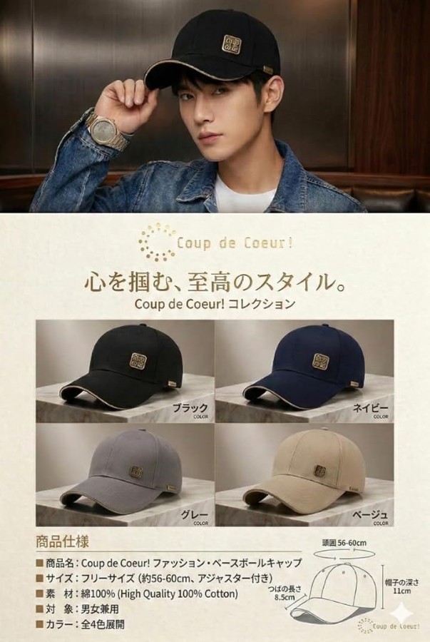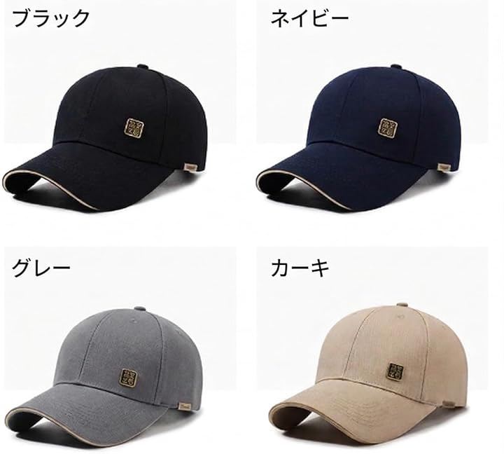 仕様 素材: コットン(綿) 機能: 遮陽・防日焼け(UV対策)、吸汗通気、サイズ調整可能 カラー: ブラック/ネイビー/グレー/ベージュ サイズ: フリーサイズ 「サイズ・寸法目安」 フリーサイズ: 頭周り 約56-60cm(アジャスターで調節可能) ツバの長さ: 約8.5cm 帽子の深さ: 約11cm