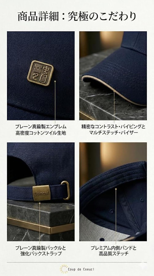 ツバのサイドにも小さなメタルタグをあしらい、シンプルながらも洗練された大人のこなれ感を演出します。
