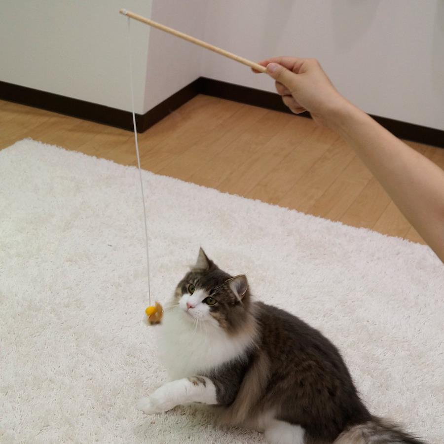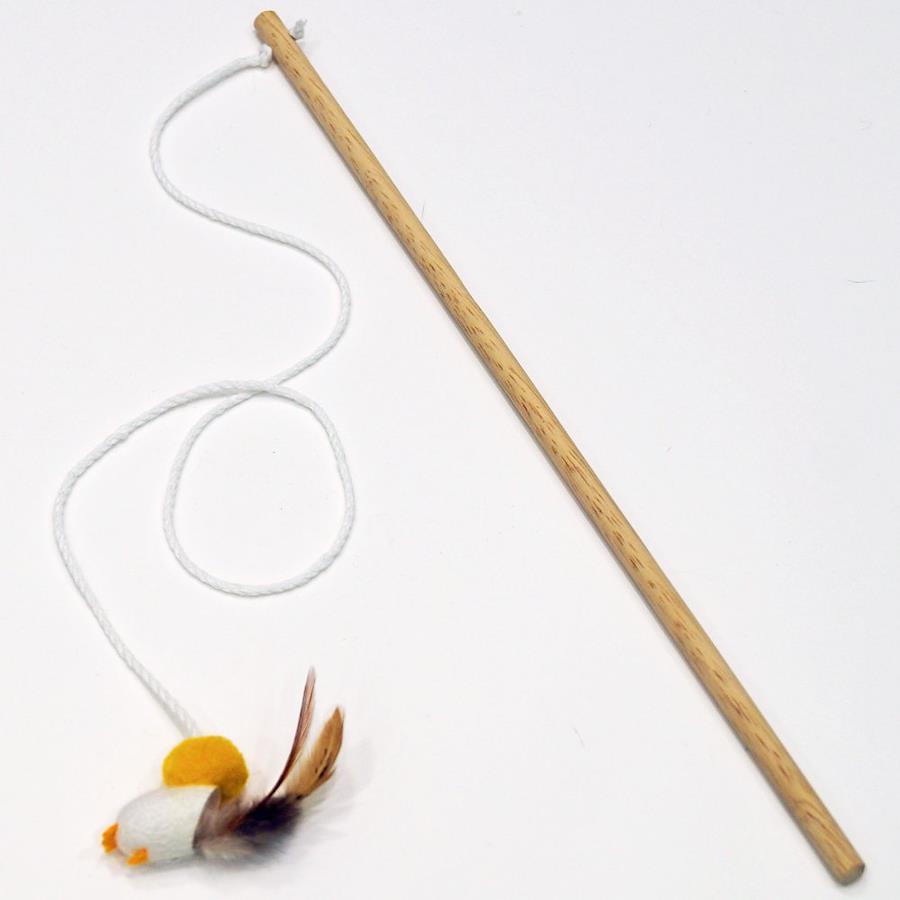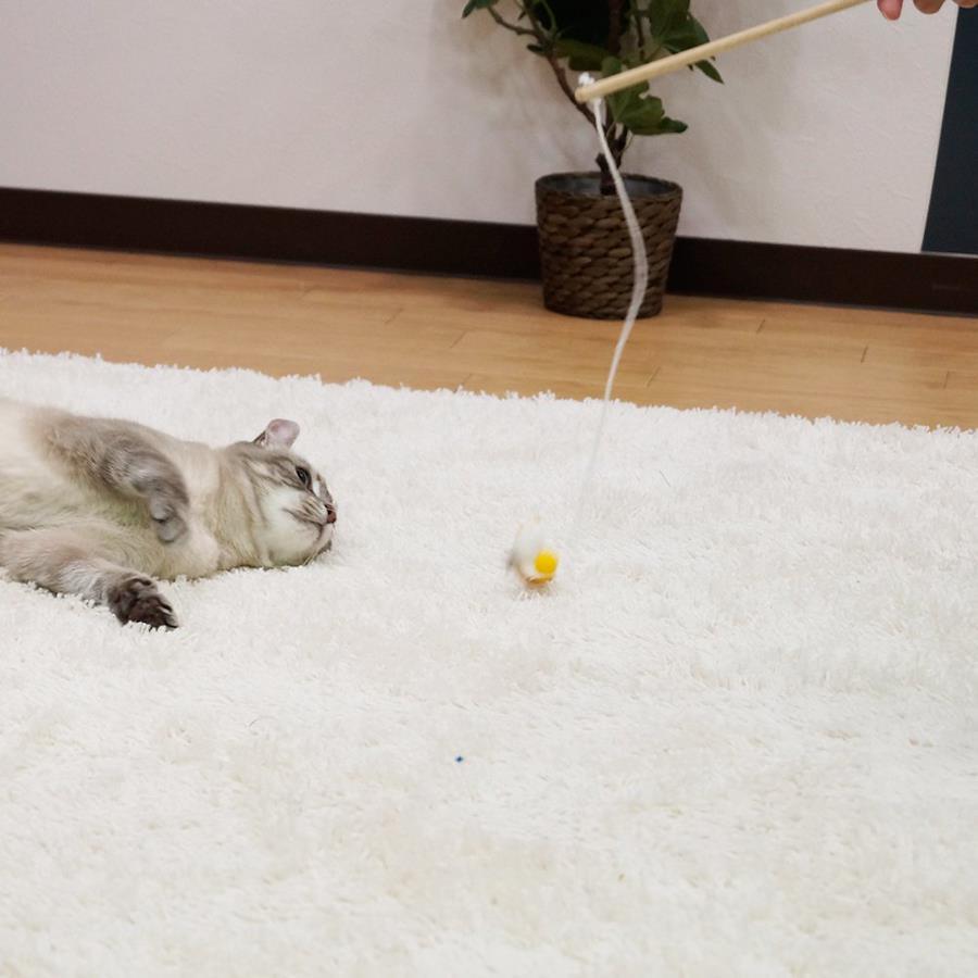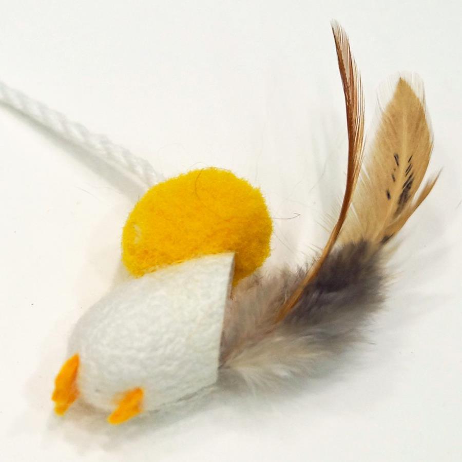 カイコの匂いが残る天然まゆと、猫ちゃんが大好きな鳥の羽つき。とても軽い天然まゆで、獲物のように予測不可能な動きができ猫ちゃん大興奮。かわいいとりモチーフの猫じゃらしです。