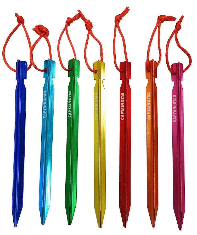カラフルなジュラルミン製のペグです。キャンプサイドをカラフルにいろどります