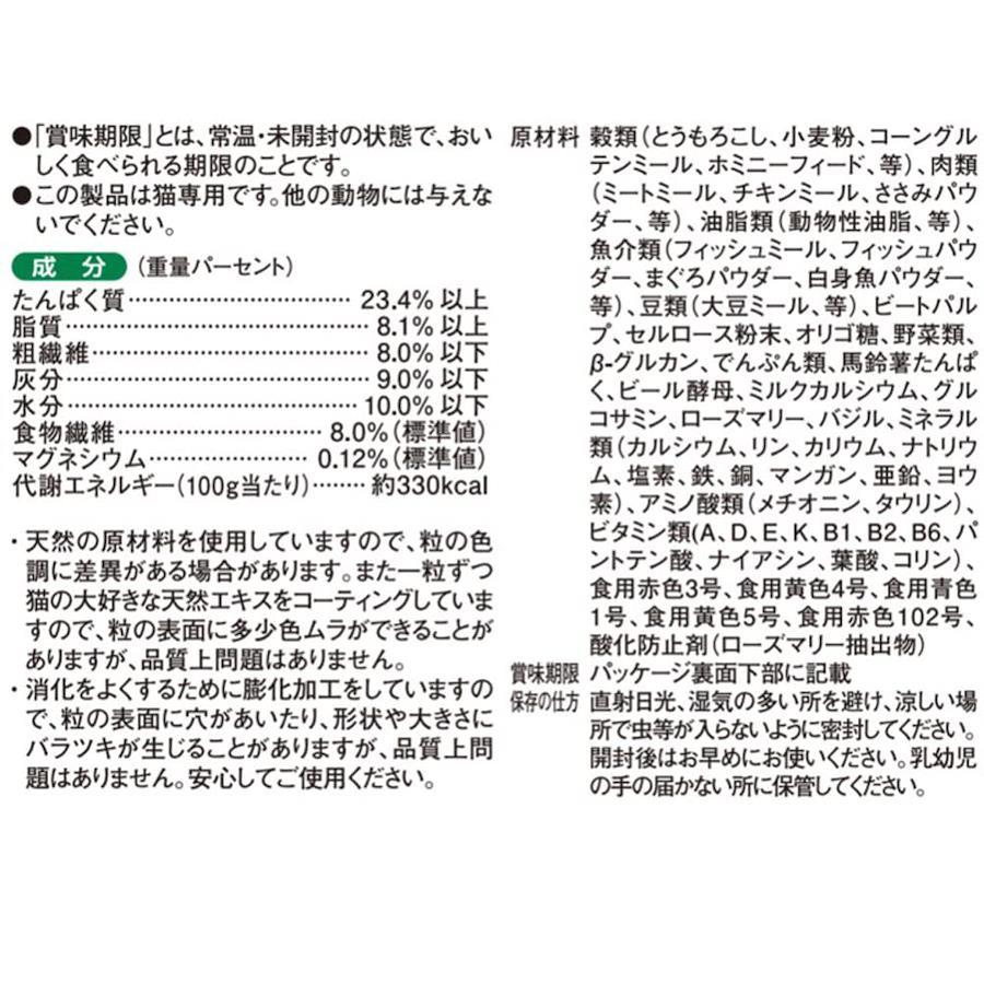 たんぱく質・・・23.4%以上、脂質・・・8.1%以上、粗繊維・・・8%以下、灰分・・・9%以下、水分・・・10%以下、マグネシウム・・・0.12%標準値、食物繊維・・・8%標準値、カロリー約330kcal/100g