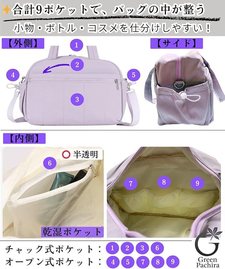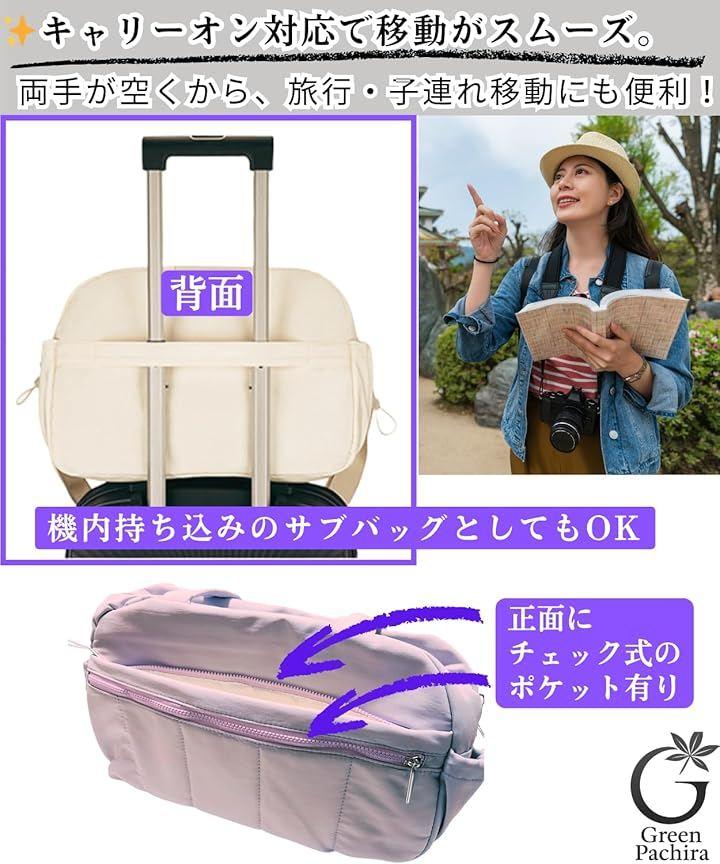 バッグの中で小物が迷子になりにくく、着替え・充電器・コスメ・チケット類などを分けて収納しやすい設計です。