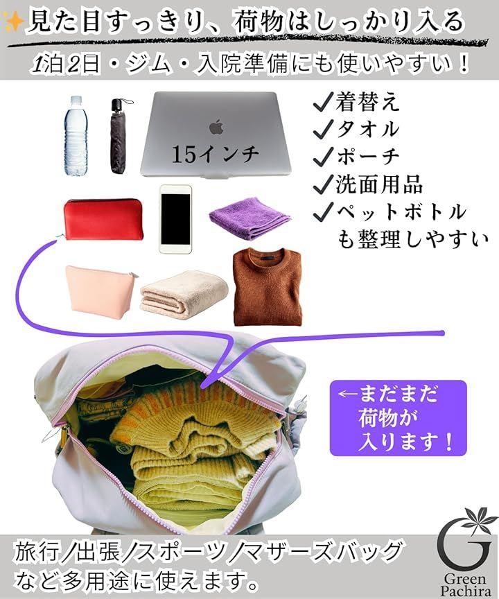 約42x30x20cmの使いやすいサイズ感で、1泊2日や一泊用バッグとしてちょうどよく、旅行・出張・ジム・ヨガ・出産を含む入院準備など幅広いシーンで活躍します。