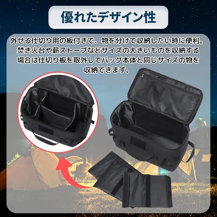 キャンプでの必需品、ガスボンベや小型の鍋、食器など分けて収納可能。