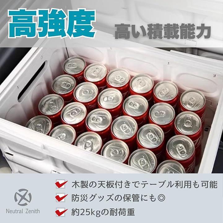 「高い積載能力・耐久性」高強度の良質なPP樹脂材を採用し、耐荷重は約25kgで安定性が高く、木製のフタ付きでテーブルとしてのご使用も可能でキャンプなどにぴったりです。