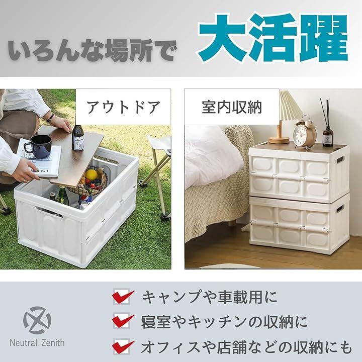 「商品詳細」キャンプ収納コンテナx1個 使用サイズ:(約) 42x28x23cm 収納サイズ:(約) 42x28x6cm 容量:約30L カラー:ホワイト / ブラック 材質:PP(本体) / 木製合板(フタ)