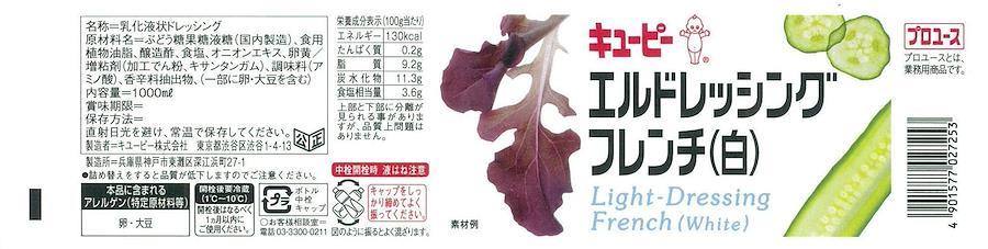 名称:乳化液状ドレッシング 原材料:醸造酢、ぶどう糖果糖液糖、食用植物油脂、食塩、増粘剤(加工でん粉、キサンタンガム)、オニオンエキス、調味料(アミノ酸)、卵黄、香辛料抽出物、(原材料の一部に大豆を含む) 栄養成分表示:100g当たり エネルギー 130kcal、たんぱく質 0.2g、脂質 9.2g、炭水化物 11.3g、ナトリウム 1.4g