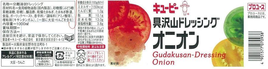 食用植物油脂(国内製造)、砂糖類(ぶどう糖果糖液糖、砂糖)、醸造酢、乾燥たまねぎ、たまねぎ酢漬、食塩、ガーリックペースト、香辛料/調味料(アミノ酸等)、増粘剤(キサンタンガム)、(一部に大豆・りんごを含む)