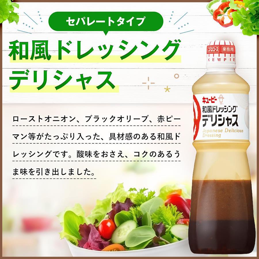 ブラックオリーブや赤ピーマンなどの具材をたっぷり使用し、酸味を抑え、コクのある旨味を効かせた甘口タイプの和風ドレッシングです。