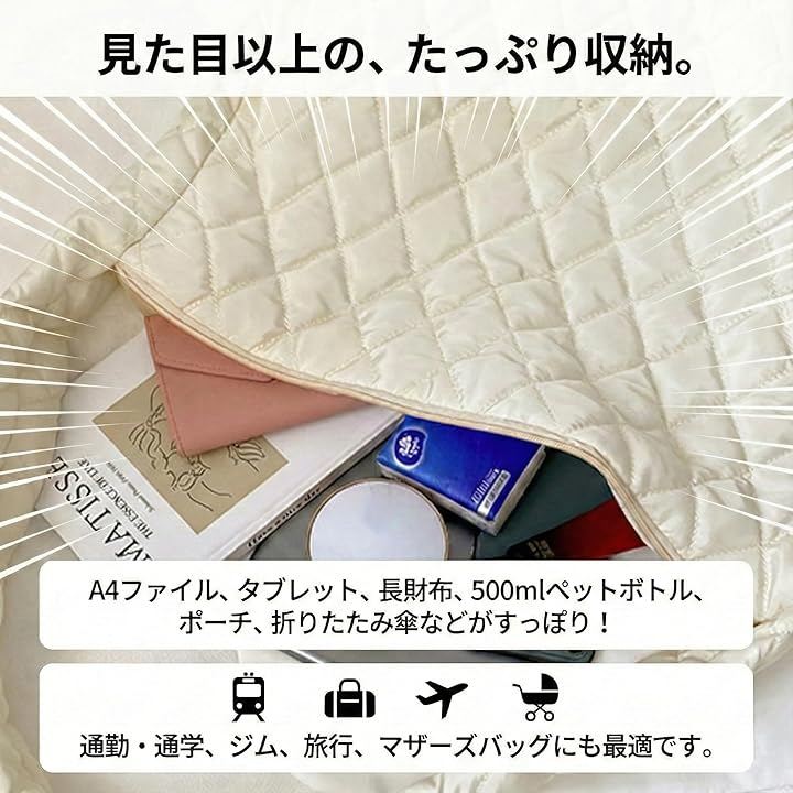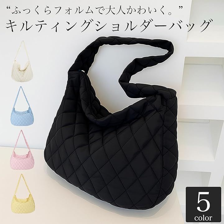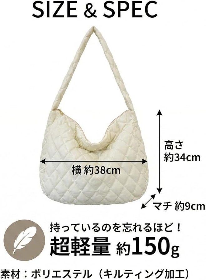「サイズ&カラー展開」 本体:横約38cmx高さ約34cmxマチ約9cm/ショルダー約60cm(肩掛け対応)/重量約150g/素材:ポリエステル(キルティング加工)/カラー:ブラック・ホワイト・ピンク・ブルー・イエローの全5色展開で、お好みのスタイルに合わせて選択可能。