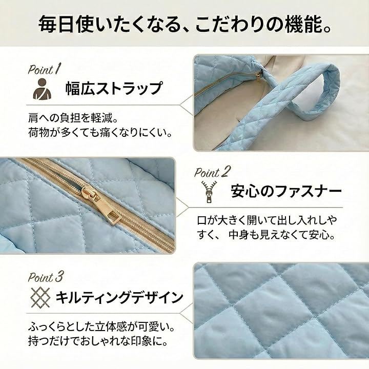 「超軽量150g&ふわ軽キルティング」 空気のように軽い約150gの超軽量設計と、ふっくらキルティング加工により長時間の使用でも肩が痛くなりにくい設計。