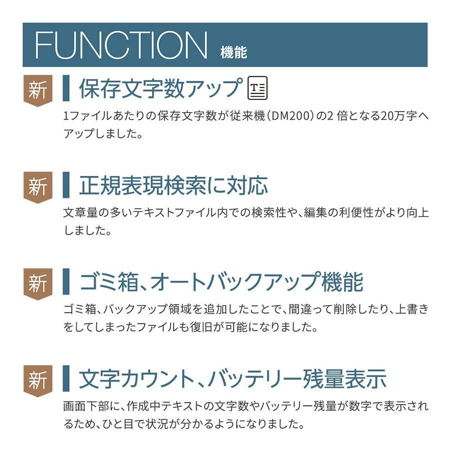 バッテリー容量がアップし、従来機(※)より約6時間長い約24時間の連続使用を実現しました。USB Type-Cに対応し、充電確認用LEDを搭載。また従来機(※)と比べ、打鍵音を低減し、カフェや交通機関などのオープンスペースでも使いやすくなりました。(※当社調べ。従来機DM200との比較)