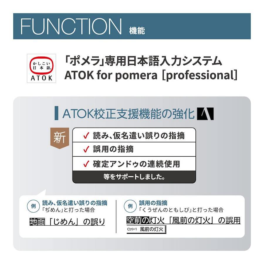 「ポメラ」専用の日本語入力システム、「ATOK for pomera〔Professional〕」がさらに使いやすく進化しました。校正支援機能を強化し、読み・仮名遣い誤りの指摘、誤用の指摘、確定アンドゥの連続使用等をサポートし