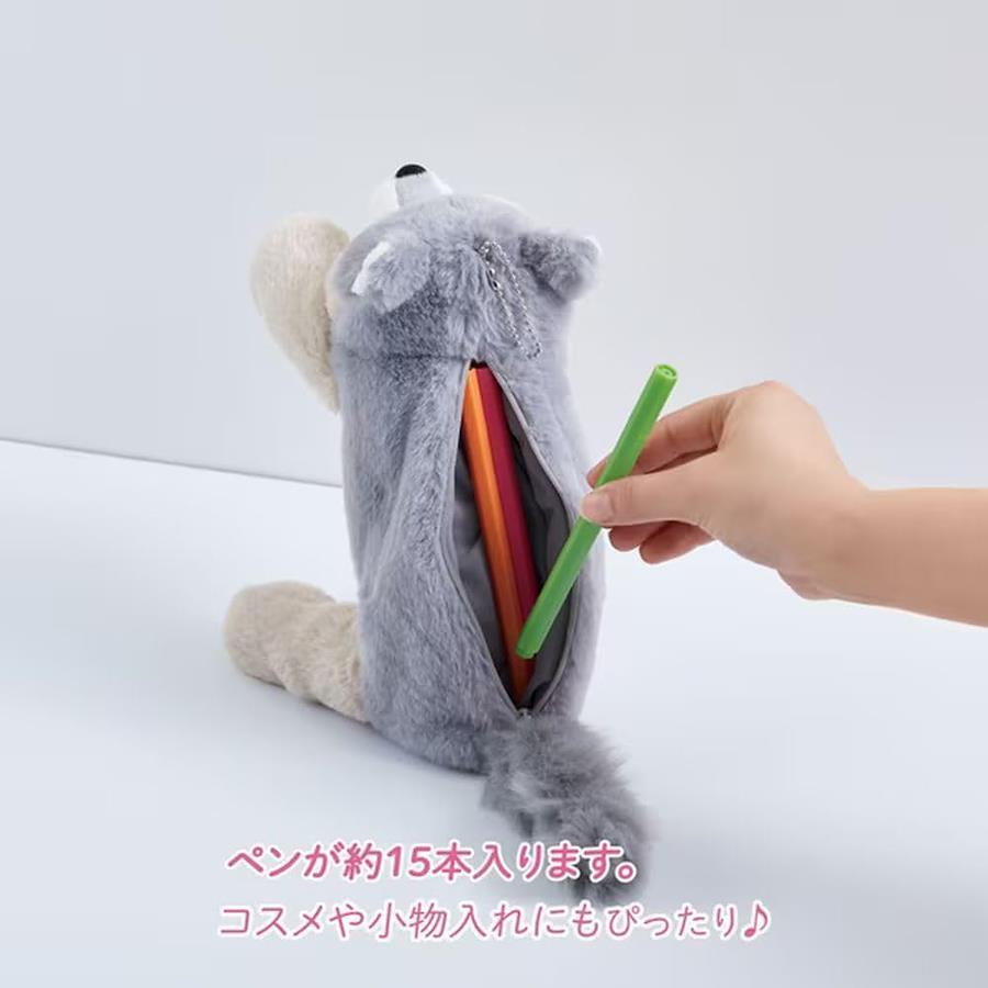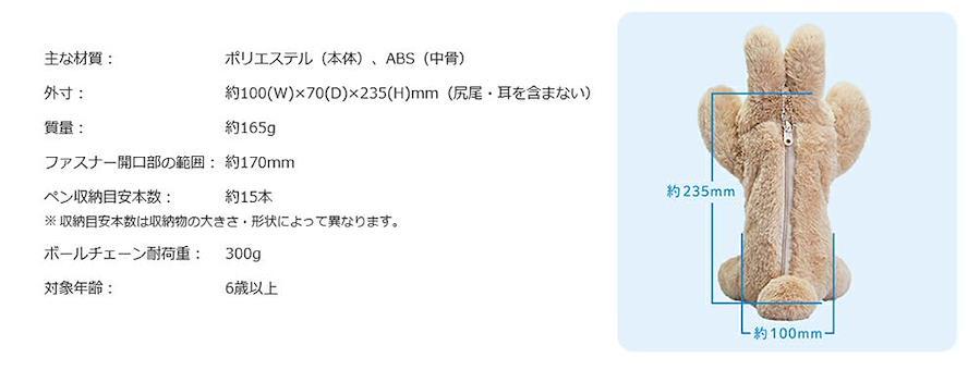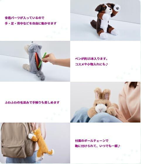 ♪好きなポーズがとれるかわいいペンポーチ♪【商品説明】○骨格パーツが入っているので手・足・背中などを自由に動かせます。○ペンが約15本入ります。コスメや小物入れにも♪○ふわふわの毛並みで手触りも楽しめます。○付属のボールチェーンで鞄に付けられて、いつでも一緒♪【詳細】・主な材質:ポリエステル(本体)、ABS(中骨)・外寸:約100(W)×70(D)×235(H)mm(尻尾・耳を含まない)・質量:約165g・ファスナー開口部の範囲: 約170mm・ペン収納目安本数:約15本※収納目安本数は収納物の大きさ・形状によって異なります。・ボールチェーン耐荷重:300g・対象年齢:6歳以上 ご注意※手・足・背中・耳を曲げすぎると中骨が破損する恐れがあります。※収納物が入った状態では、背中が曲げられない場合がございます。中骨や収納物の破損の原因となりますので、無理に曲げたりしないでください。