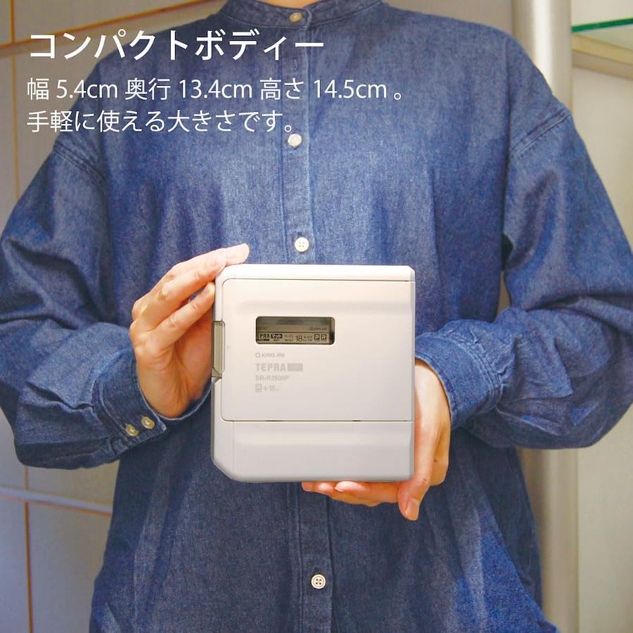 スマホで手軽にラベル作成本体とスマートフォンをBluetoothで接続し、アプリを使用してラベル作成ができるスマホ専用の「テプラ」です。iOS/Androidアプリ「TEPRA LINK2」と「Hello」の2種類のアプリに対応。作成したラベルはアプリ内で保存ができるので、いつでも編集することが可能です。また本体は乾電池駆動のため、場所を選ばずにラベル作成ができます。※ACアダプタ非対応4~18mm幅の「テプラ」PRO用テープカートリッジに対応色・幅・素材が豊富な「テプラ」PRO用テープカートリッジ、4~18㎜幅に対応しています。整理収納やお名前つけなどの幅広いシーン使用できます。ラベルのデザインをインテリアに合わせて選べば、ワンランク上の仕上がりに。用途に合わせて選べる2種類のアプリ「TEPRA LINK2」オブジェクトの吸着やガイド線の表示、回転やサイズ変更など直感的なラベル編集が可能。フラットなデザインから、従来の「テプラ」の記号や絵文字まで豊富に搭載しています。ラベルを1ファイルに複数作成して、一括印刷できる機能や、バーコード印刷、連番印刷など、便利な機能も多数搭載しています。用途に合わせて選べる2種類のアプリ「Hello」シーンや用途に合わせた多彩なテンプレートの中から気に入ったデザインを選び、印刷するだけで誰でも簡単にラベルを作成することができます。新しいラベルの使い方を紹介する特集記事の更新にあわせて、定期的にテンプレートや絵文字を追加。お好みのデザインを選んでラベルを作成できます。品番:SR-R2500Pシロ本体色:ホワイト本体寸法:約54(W)×134(D)×145(H)㎜質量:約420g(電池、テープ除く)プリンタ:サーマルヘッド(180dpi/96dot)熱転写PRO印刷方式最大印刷可能幅:13.5mmテープカートリッジ:PRO テープカートリッジ4、6、9、12、18mmカッター:オートカッター電源:単3 形アルカリ乾電池×6 本(別売)または単3 形充電式ニッケル水素電池×6 本(別売)インターフェース:Bluetooth接続セット内容:本体、取扱説明書(保証書付)【ご使用上の注意】精密機械ですので取扱いにご注意ください。直接日光の当たる場所や、高温・多湿の場所での使用または保管はしないでください。商品の見直しなどのため、仕様・価格・デザインその他は予告なく変更する場合があります。商品の色は撮影などの関係で実際の色とは異なって見えることがあります。本製品は日本国内専用です。