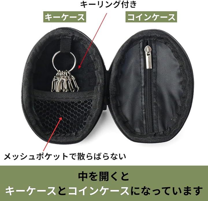 バラけないようメッシュポケットに鍵を収められるようになっており、反対側のジッパーポケットはコインケースとして小銭を入れられます。
