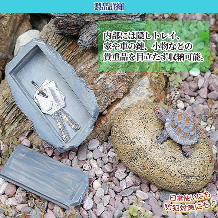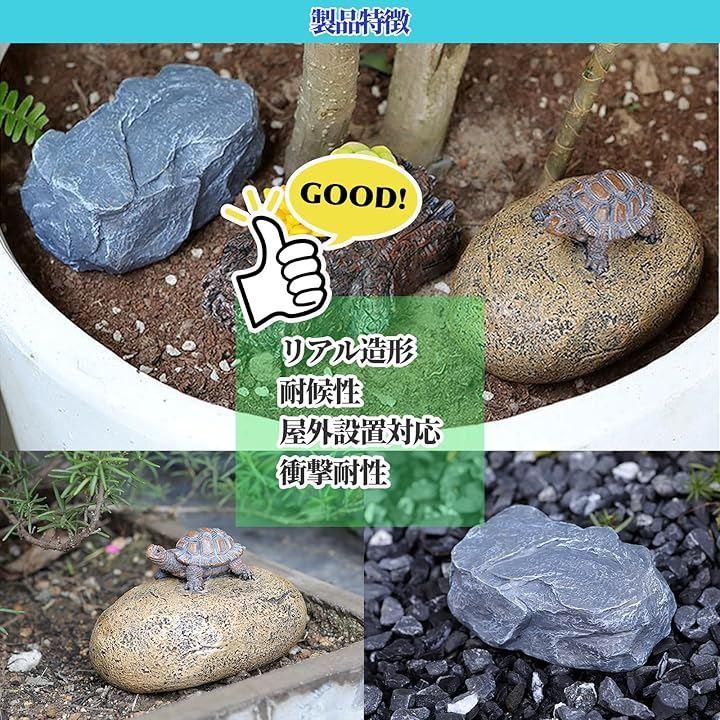 「サイズ・仕様」「材質」樹脂 「特徴」リアル造形、耐候性、屋外設置対応、衝撃耐性 「バリエーション」石/石+亀